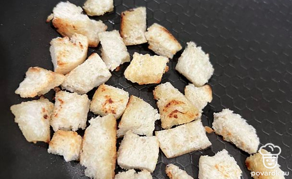 Хлеб нарежьте на маленькие кубики и обжарьте до румяности на сковороде.