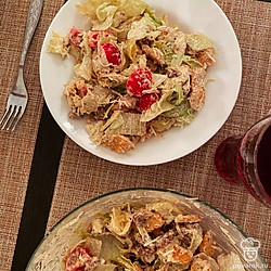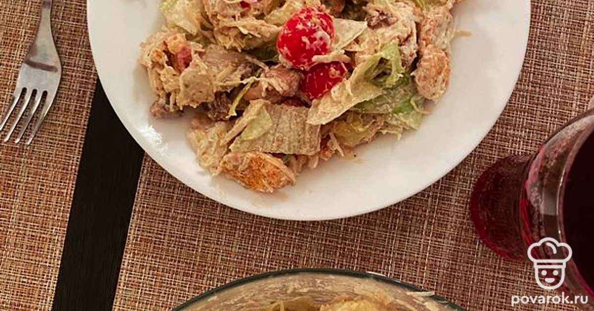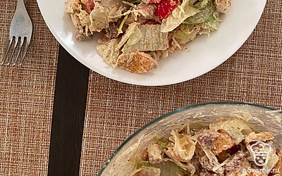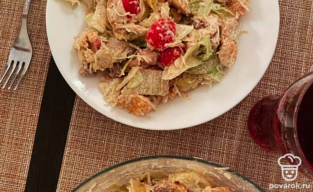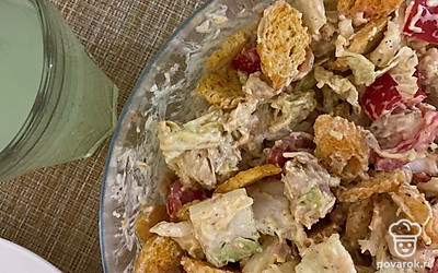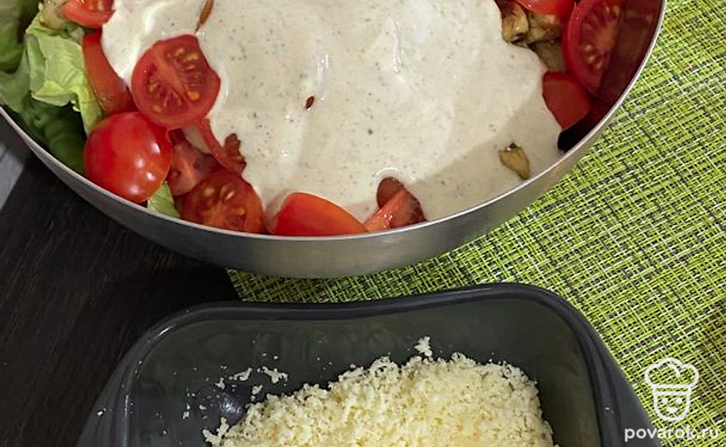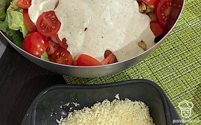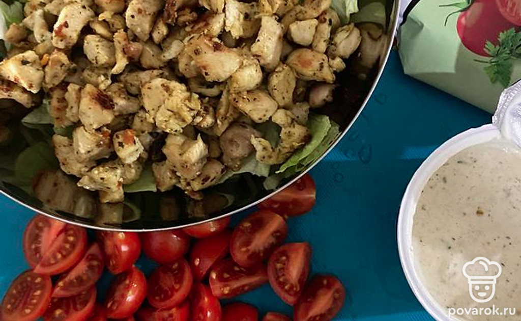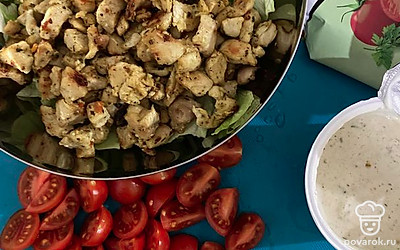Готовые и нарезанные ингредиенты соединяем в миске. Следующим шагом можно сделать соус. Смешиваем сухую смесь «Цезарь» с греческим йогуртом и тщательно перемешиваем.