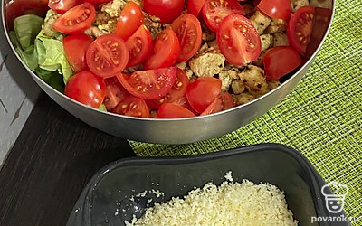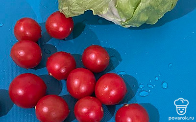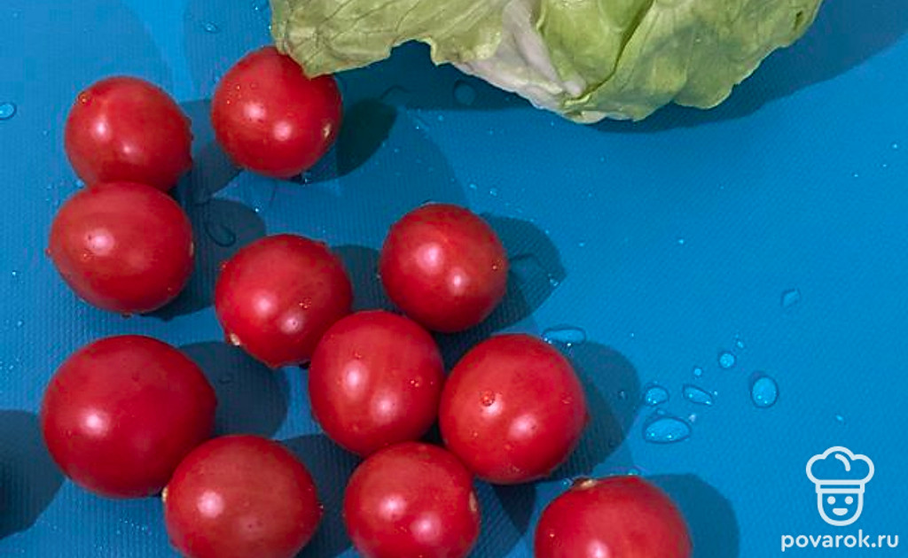 Нарезаем черри на половинки или четвертинки (в зависимости от размера помидорки), листья айсберга так же режем на части.