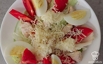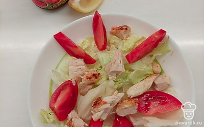 Рвем салат, режем помидоры и добавляем к ним курицу.