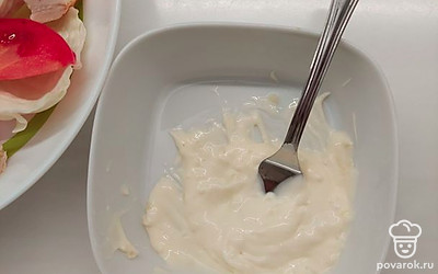 Для соуса: к майонезу добавляем чеснок и лимонный сок. Чеснок пропускаем через пресс. Заправляем салат. Не забудьте яйцо.