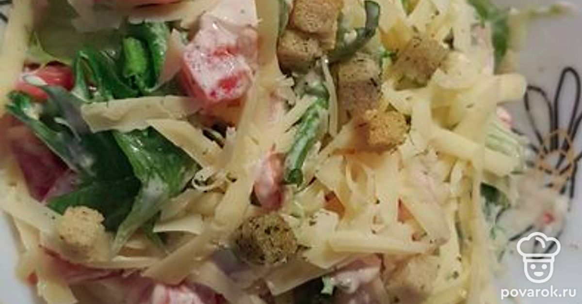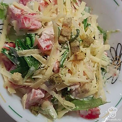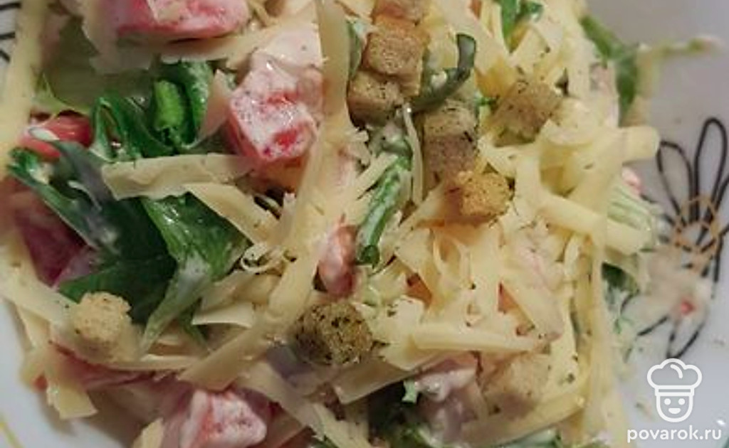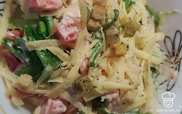 Добавляем соус «цезарь», перемешиваем. Трем сыр, сверху выкладываем сухари.