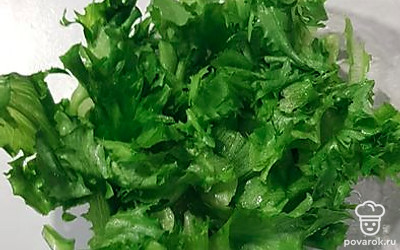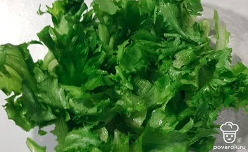 Креветки заливаем кипятком, оставляем на 10 минут. Затем очищаем листья салата, режем.