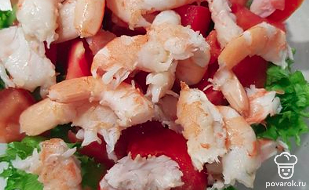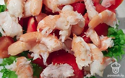 Нарезаем помидоры, чистим креветки, выкладываем.
