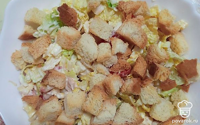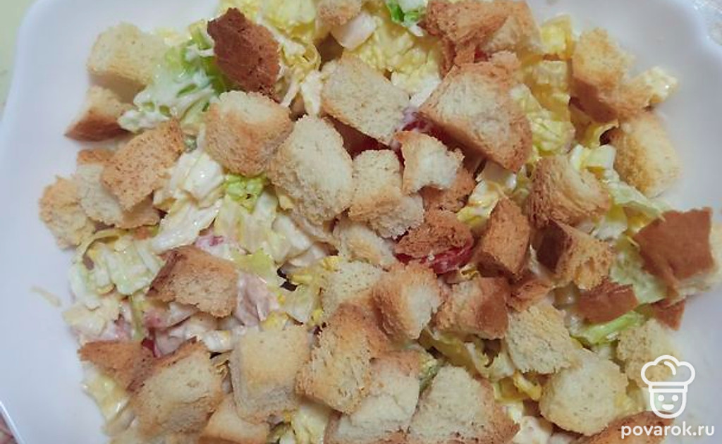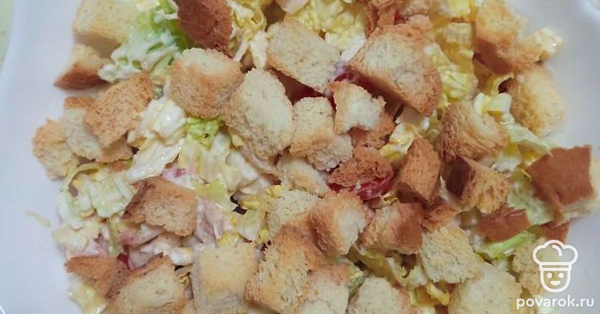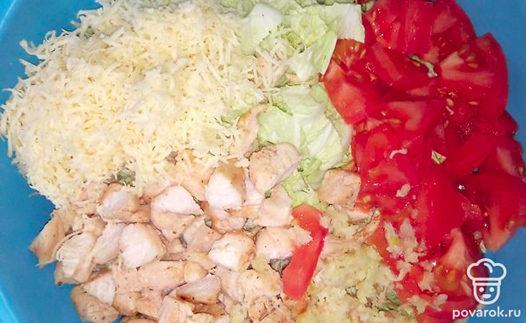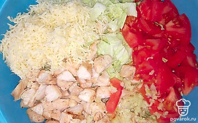 Добавить жареную или запеченую грудку, натертый сыр, нарезанные помидоры, раздавленный чеснок.