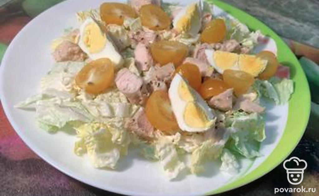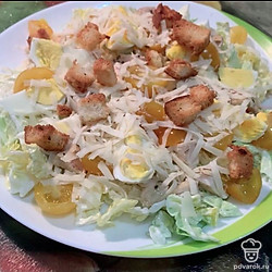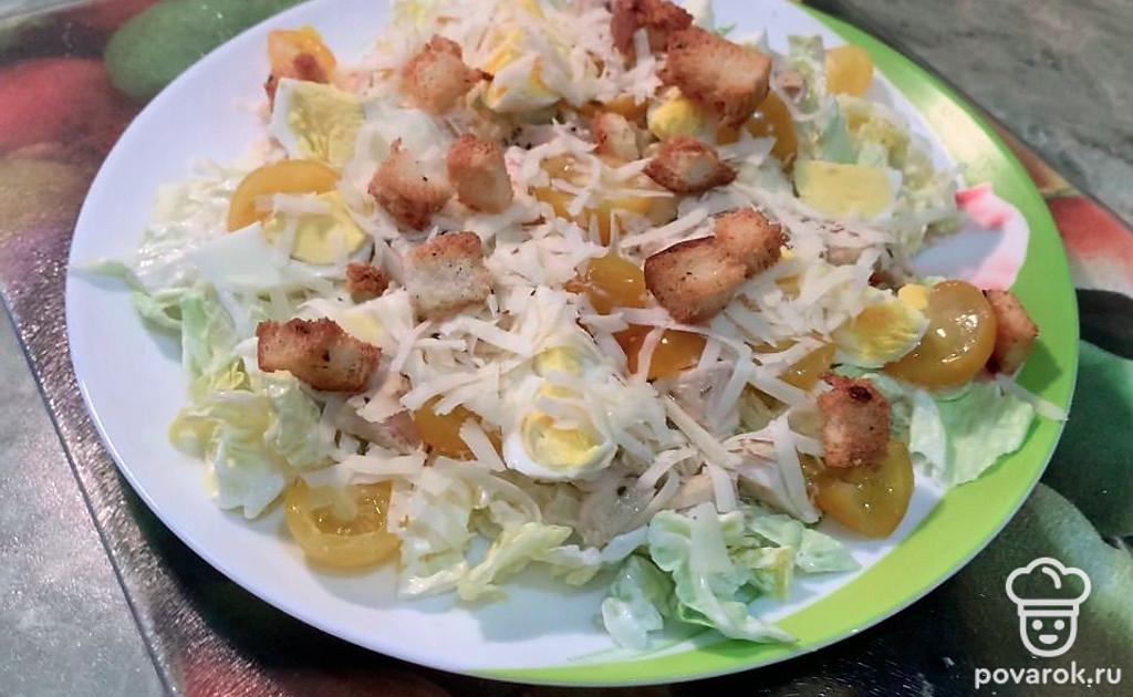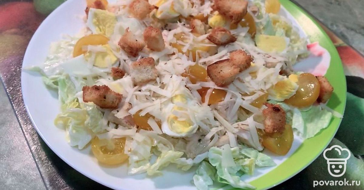 Нарежьте все необходимые ингредиенты. Сырую курицу и белый хлеб на небольшие квадратные кусочки, помидоры Черри на половинки, ломтиками пекинскую капусту, сыр натереть на тёрке. Вареные яйца пополам и далее на дольки. Кусочки курицы замариновать в небольшом количестве масла с прованскими травами, обжарить на сковороде до готовности.