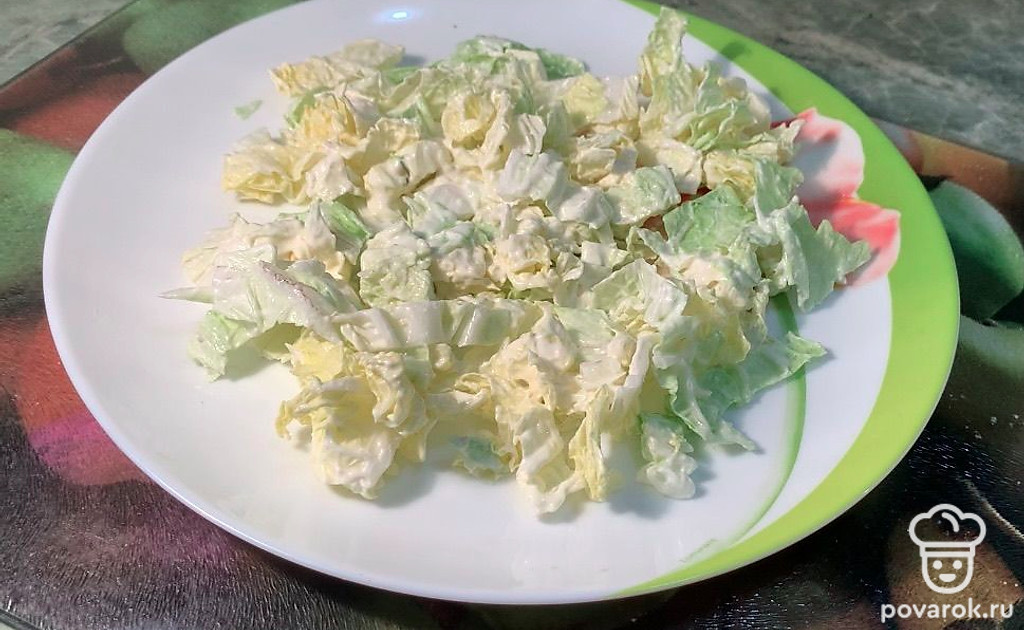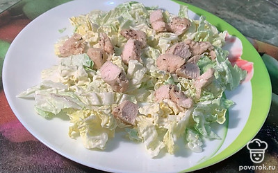 Ломтики пекинской капусты перемешать с соусом Цезарь и выложить на блюдо.