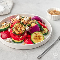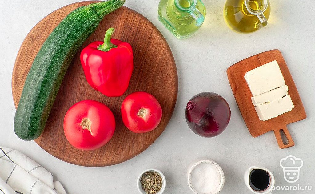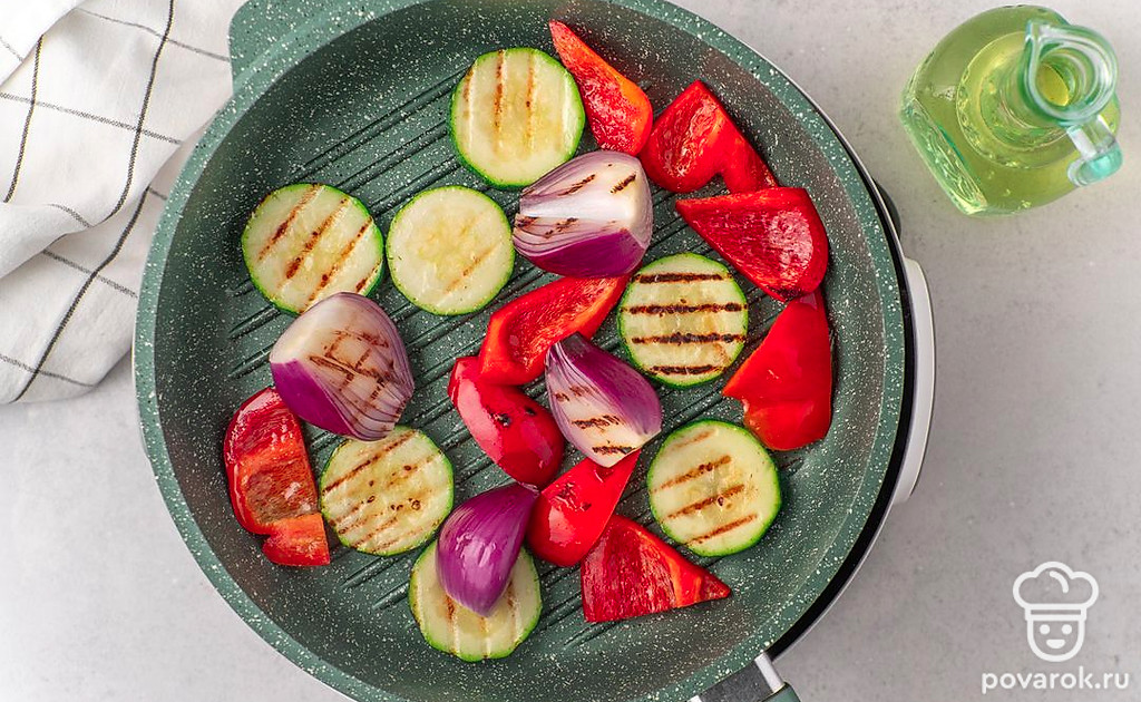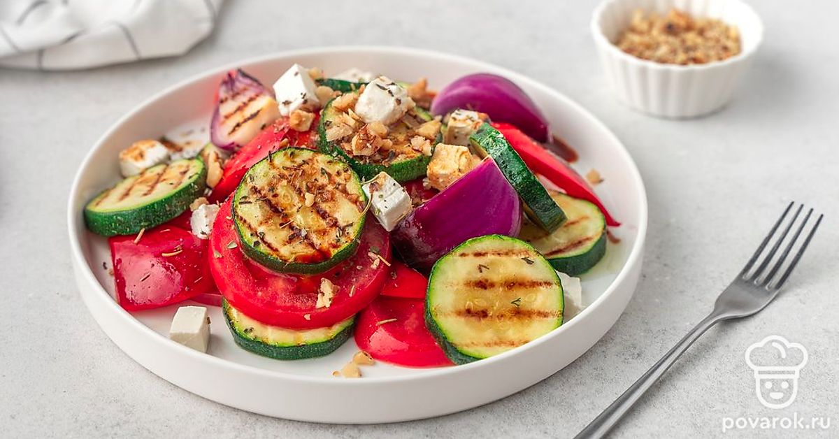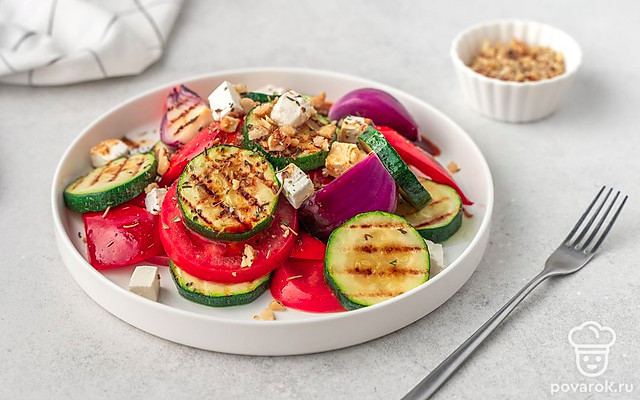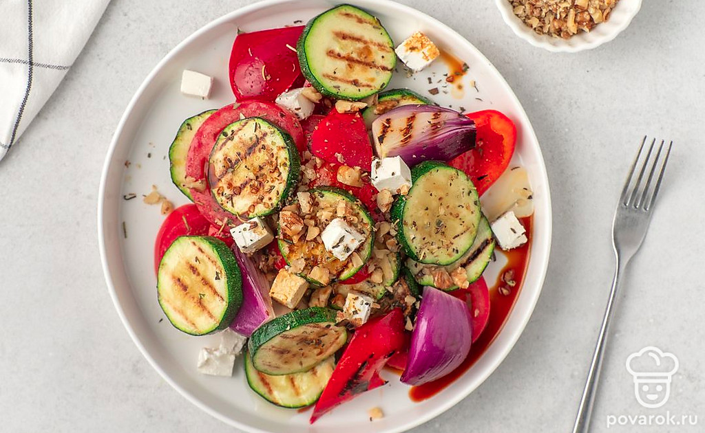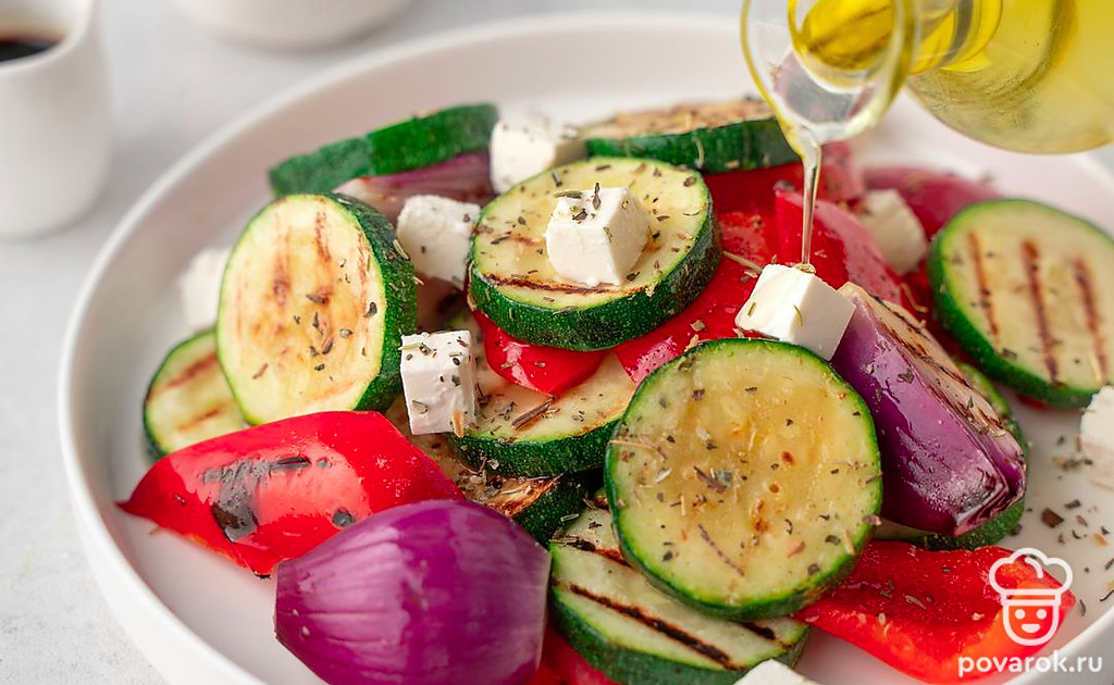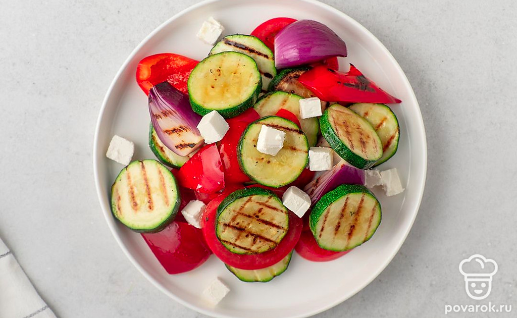 Подрумяненные на гриле сладкий перец и цукини, слегка карамелизированный лук, свежие помидоры и соленый сыр фета: все это соединяется в сытной и очень вкусной летней закуске, своеобразной гриль-версии греческого салата. Для обжарки овощей подойдет электрический гриль, сковорода-гриль или угольный мангал. Не держите овощи на огне слишком долго, они должны прожариться до состояния аль денте, то есть остаться немного твердыми и хрустящими.