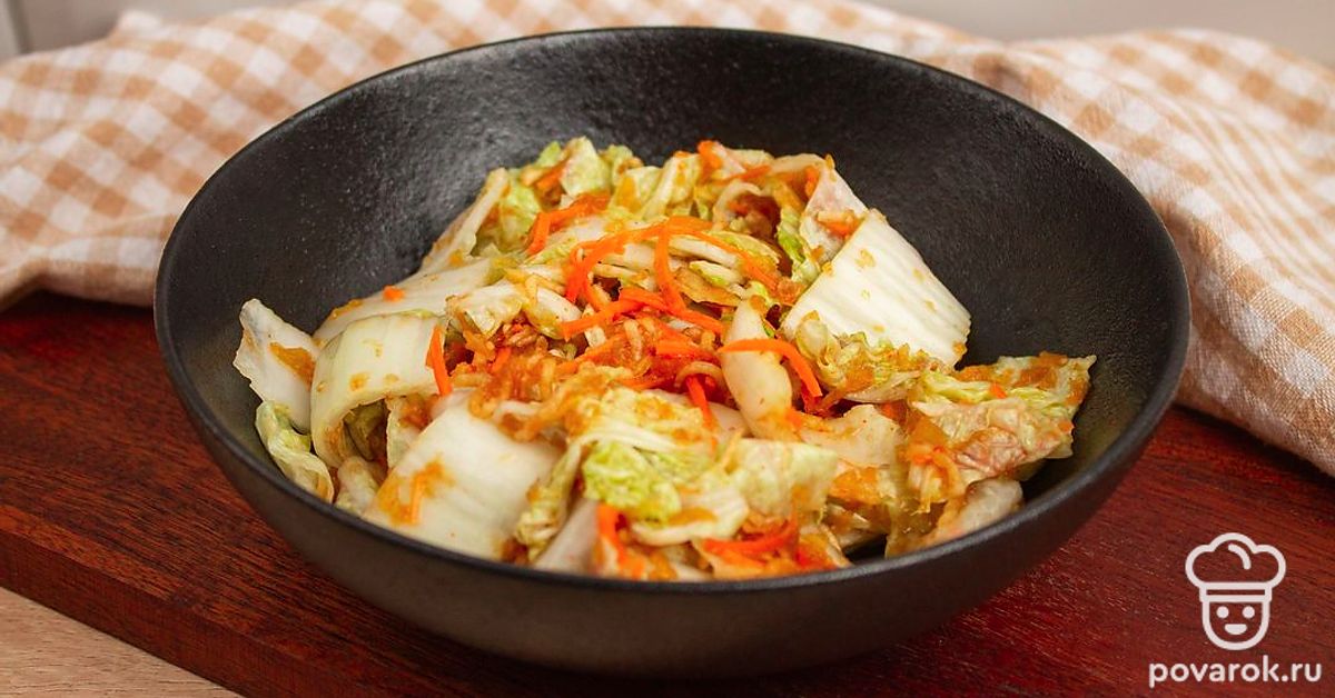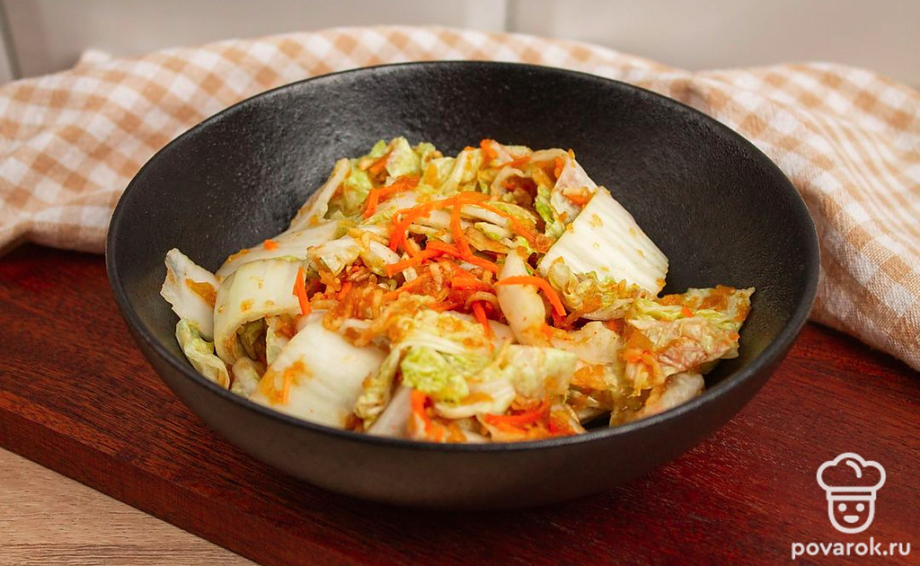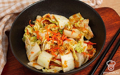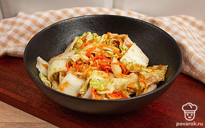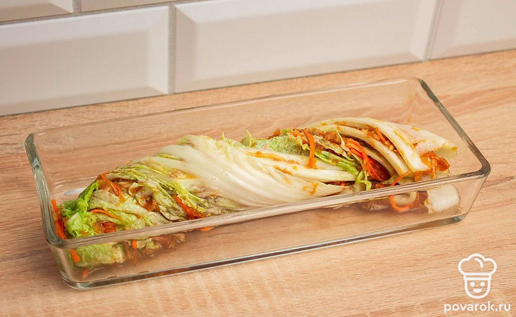 Каждый лист пекинской капусты намажьте подготовленной заправкой, уложите капусту в подходящую емкость и оставьте на сутки в тепле, чтобы промариновалась.