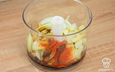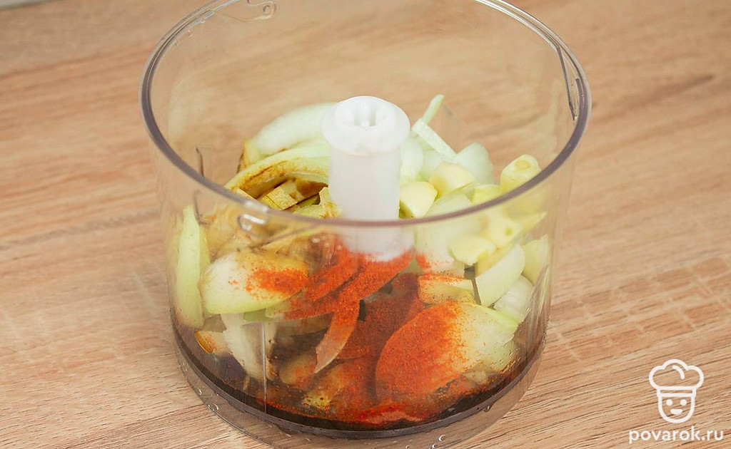 Нарежьте лук полукольцами, чеснок на части. Смешайте в блендере лук, чеснок, паприку, соль, сахар и соевый соус.