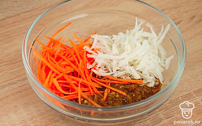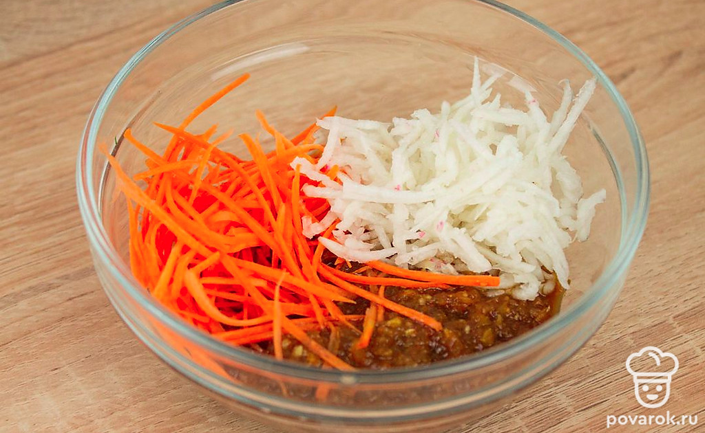 Нарежьте морковь соломкой, редис натрите на терке. Смешайте с готовой заправкой из лука и чеснока со специями.