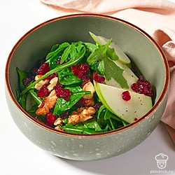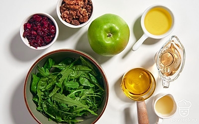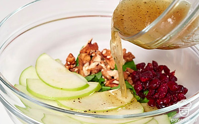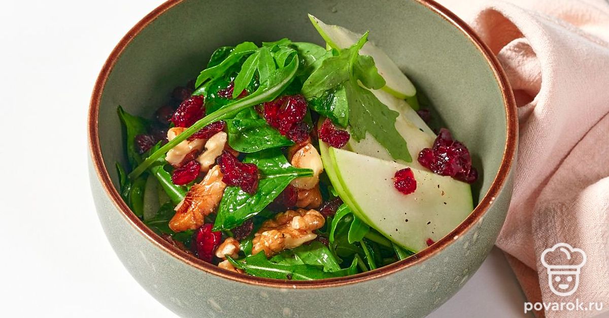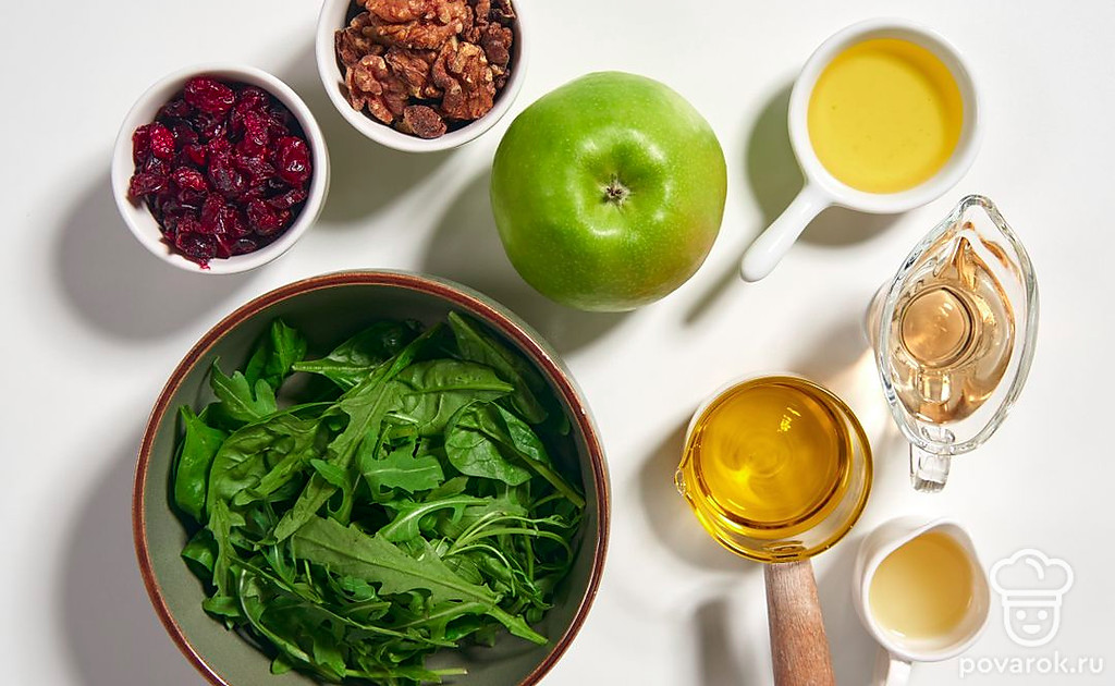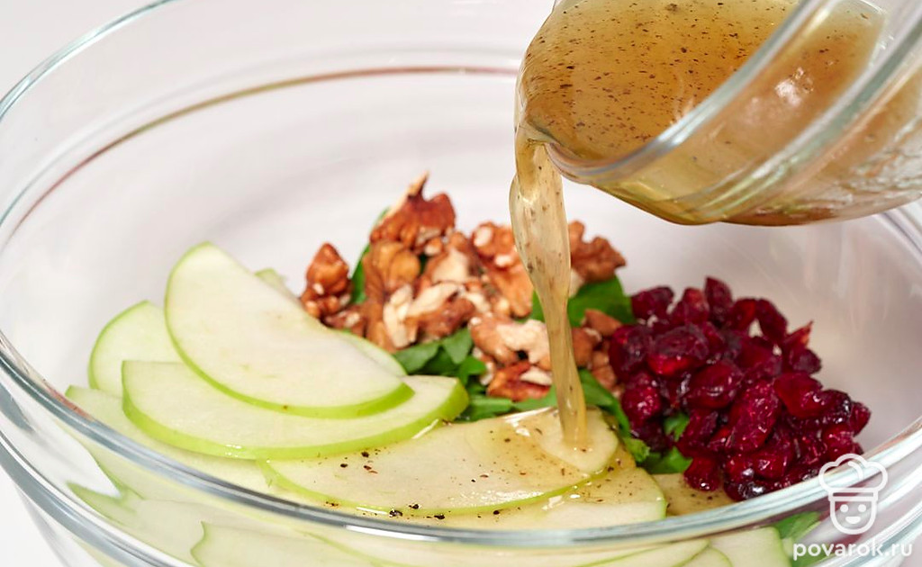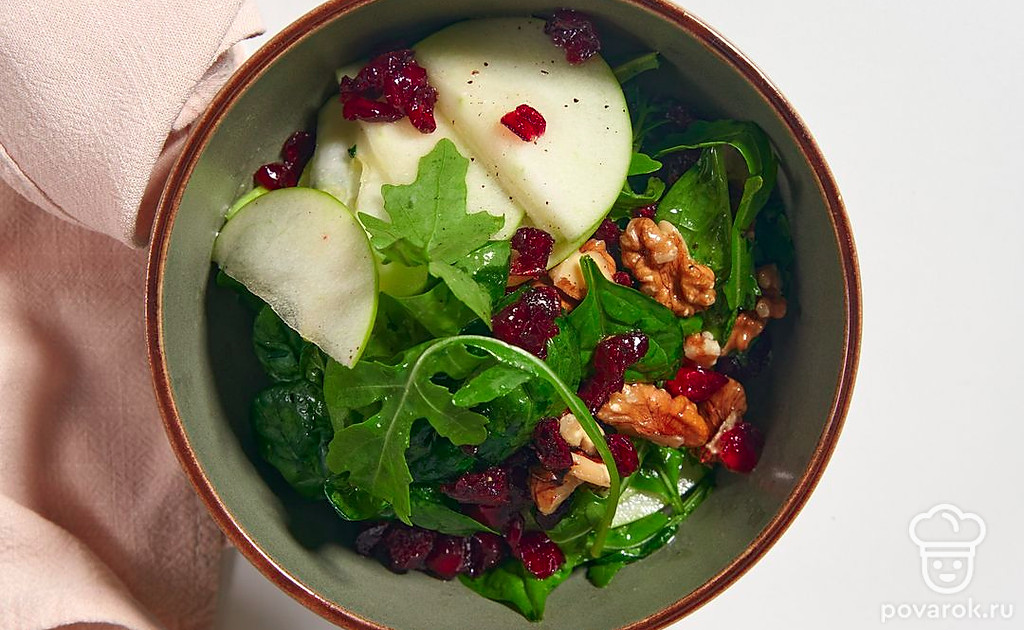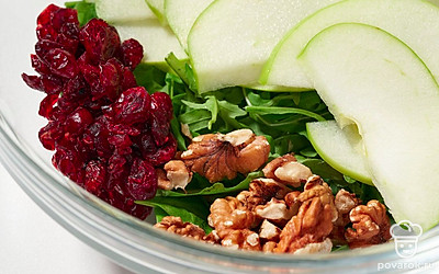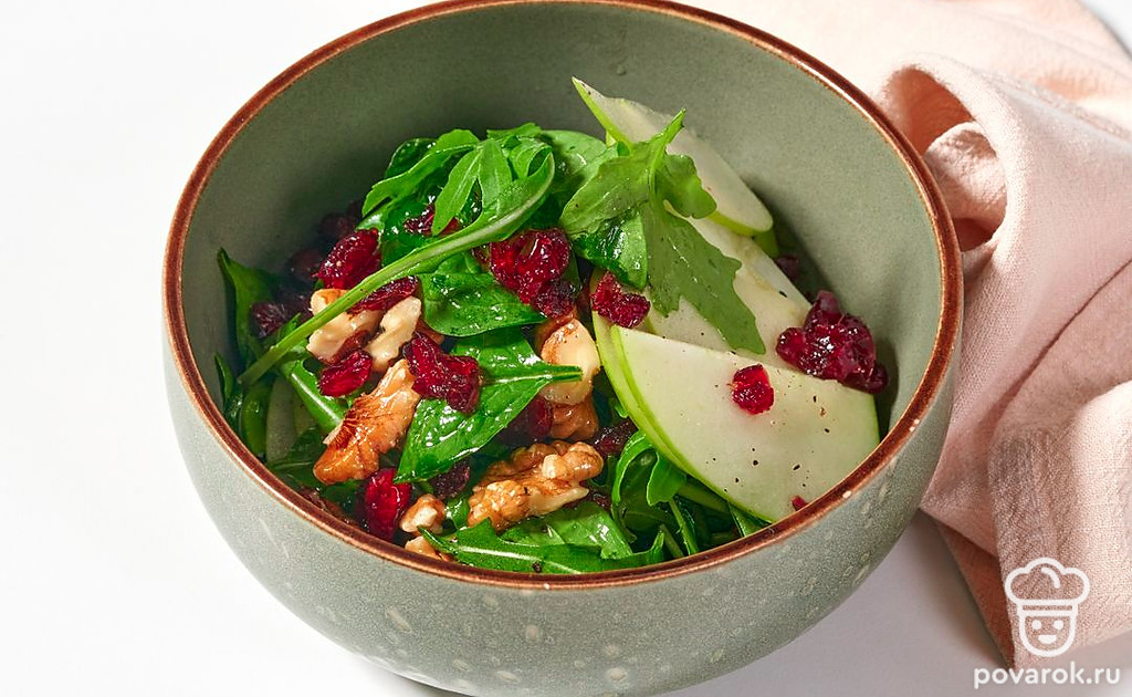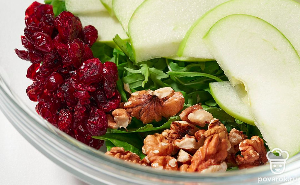 С вяленой клюквой можно приготовить множество различных блюд. В этом рецепте мы остановили свой выбор на питательном салате. Чтобы вкус такого блюда был более сбалансированным, мы добавили в него немного яблок. Лучше всего, чтобы они были кисло-сладкие. Благодаря этому салат не будет слишком приторным и хорошо дополнит другие блюда.