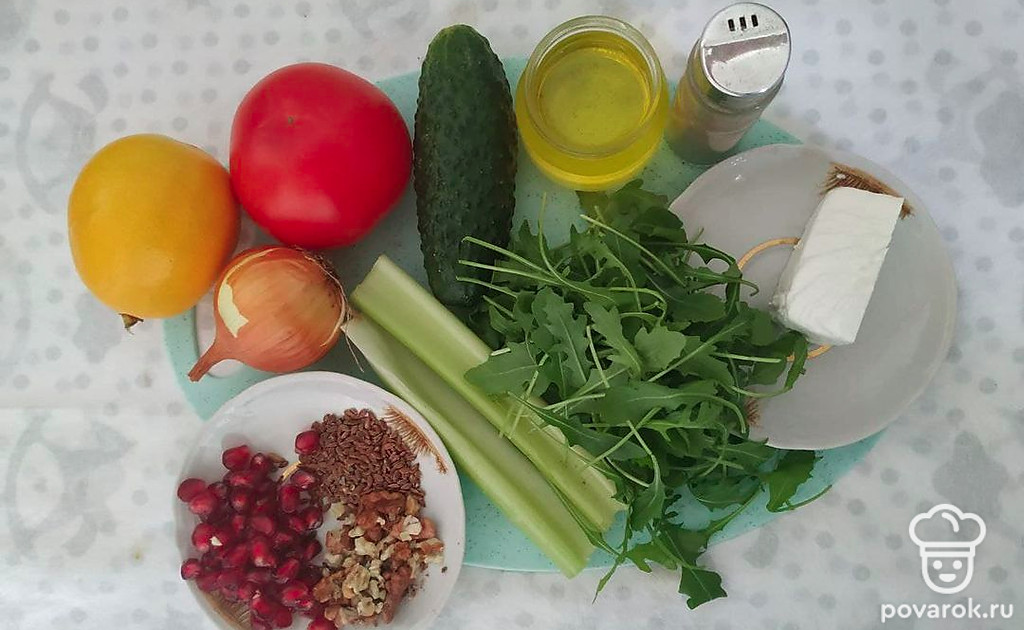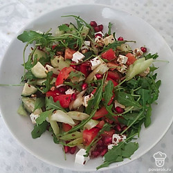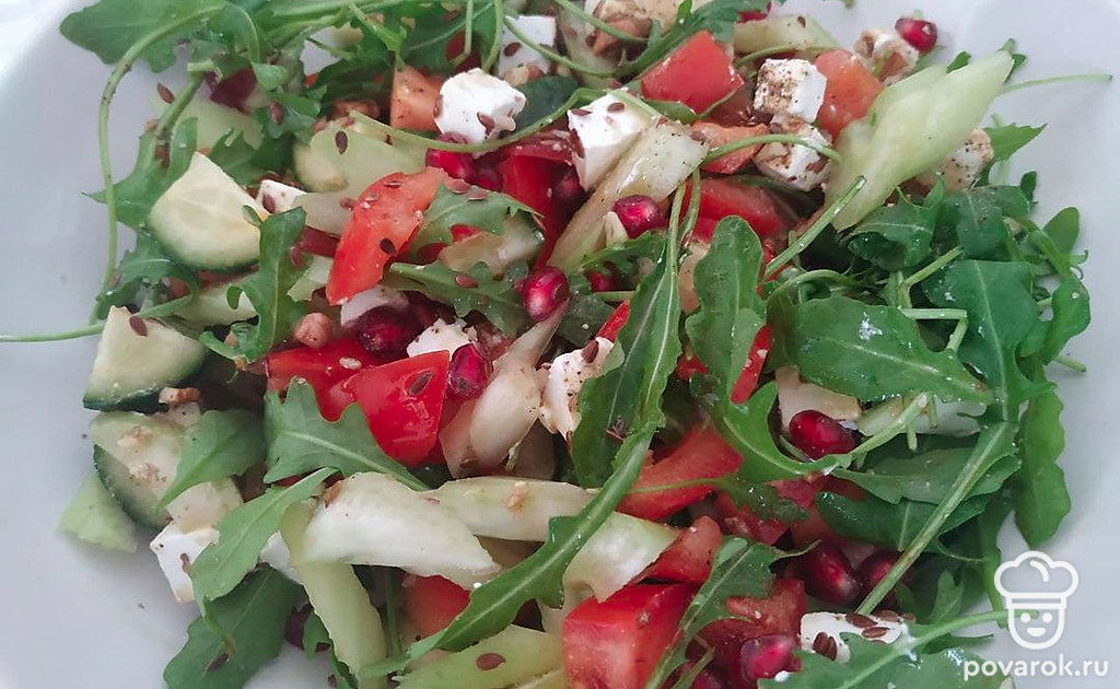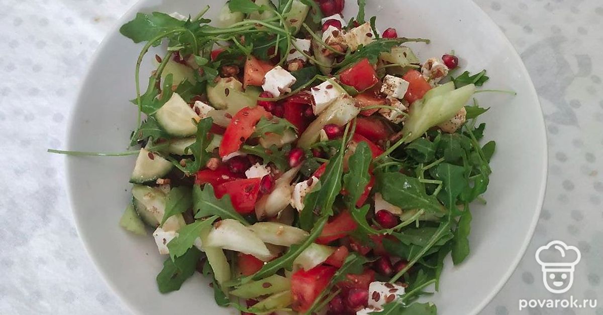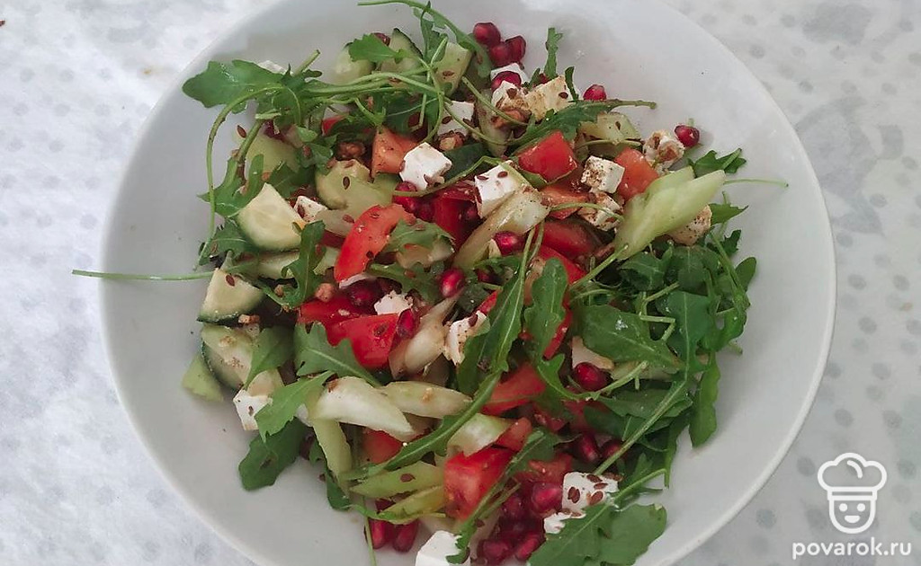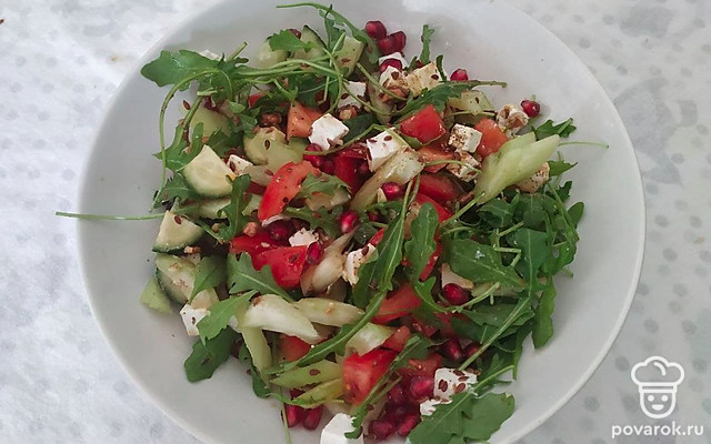 Салат с гранатом, сыром фета и овощами получается очень свежим, хрустящим и полезным. Свежие овощи гармонично сочетаются с мягким сыром фета, который обладает ярким вкусом с ноткой молочной кислинкой. Оливковое масло и лимонный сок придают блюду невероятный аромат, а зерна граната идеально подходят ко всем ингредиентам. Такой салат готовится очень просто и подходит к любым вторым блюдам.