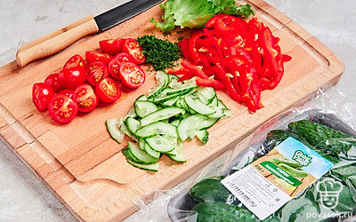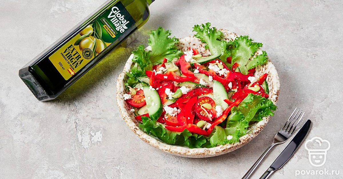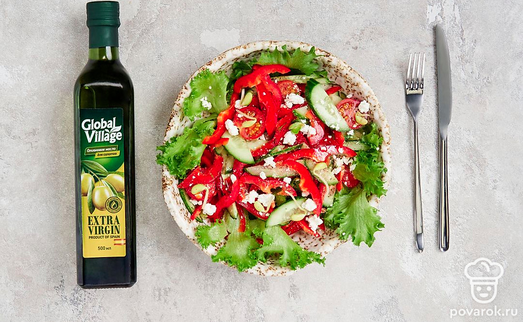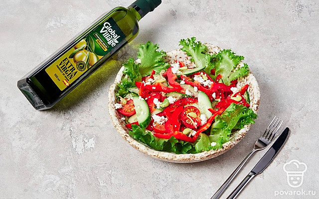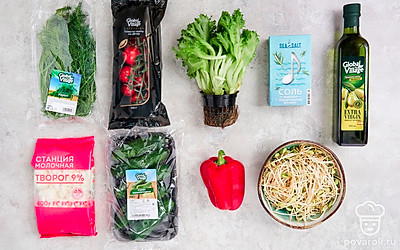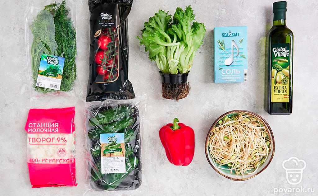 Освежающий, сочный, яркий и легкий салат «Глоток воздуха» из помидорок черри с огурцами, болгарским перцем и листьями салата. Он быстро готовится и получается оригинальным и вкусным. Нежный творог очень хорошо дополняет овощи, а также делает блюдо более сытным и соединяет ингредиенты салата между собой. Если использовать творожную массу в сливках или сметане, то можно добавить в салат меньше оливкового масла. Ростки чечевицы можно заменить на проростки пшеницы или редиса.