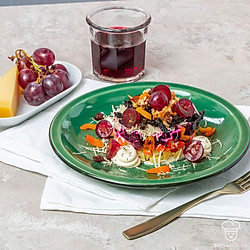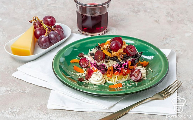 Этот рецепт отличается несложным приготовлением и очень интересным вкусом, который достигается за счет необычного сочетания ингредиентов. В классическом рецепте такого салата используются гранатовые зерна, но здесь они заменяются сухофруктами и виноградом. Эти ингредиенты добавляют блюду сладковатое послевкусие, которое прекрасно балансирует с пресноватым вкусом овощей. Готовый салат получается очень полезным. В его составе содержится множество витаминов, а также минералов — калия и кальция.