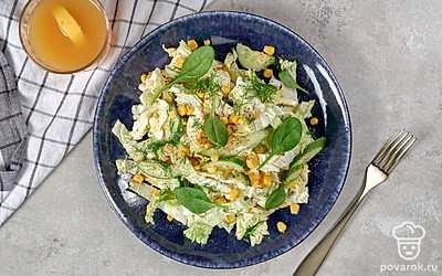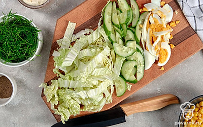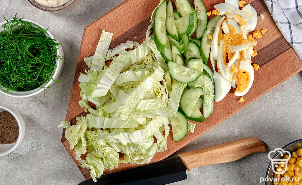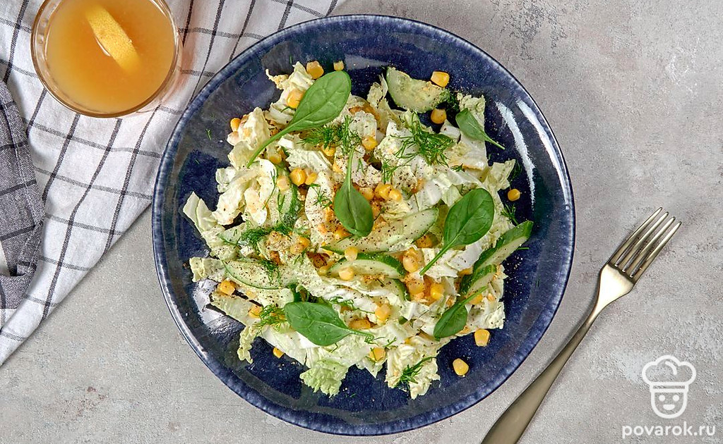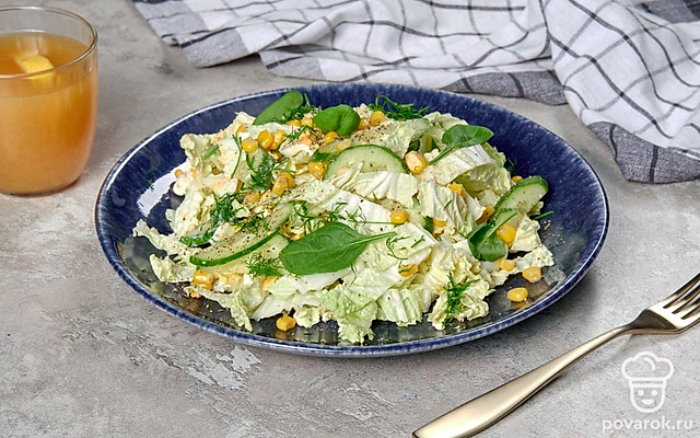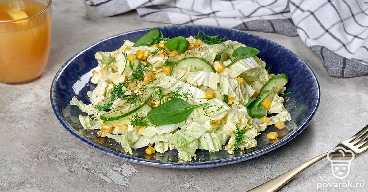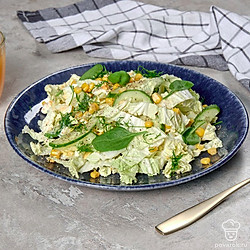 Салат из пекинской капусты, консервированной капусты, огурцов и яиц под сметаной получается легким и диетическим. Если хочется еще больше снизить калорийность блюда, можно использовать менее жирную сметану. Пекинская капуста содержит много витаминов, железа и клетчатки. Несмотря на то что овощ низкокалорийный, он притупляет чувство голода и хорошо насыщает, что делает пекинку незаменимой для людей, следящих за своей фигурой.