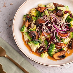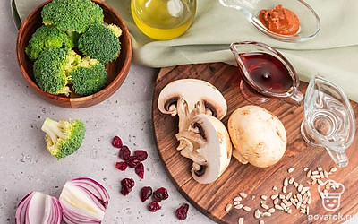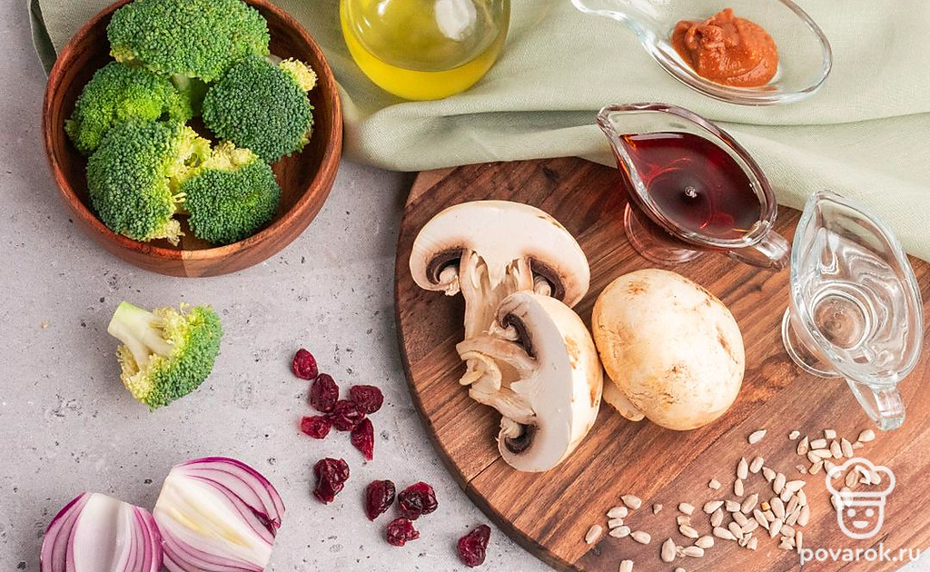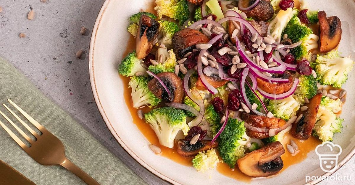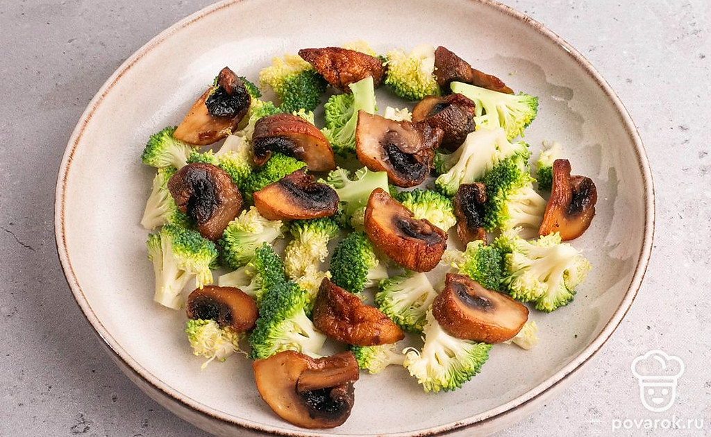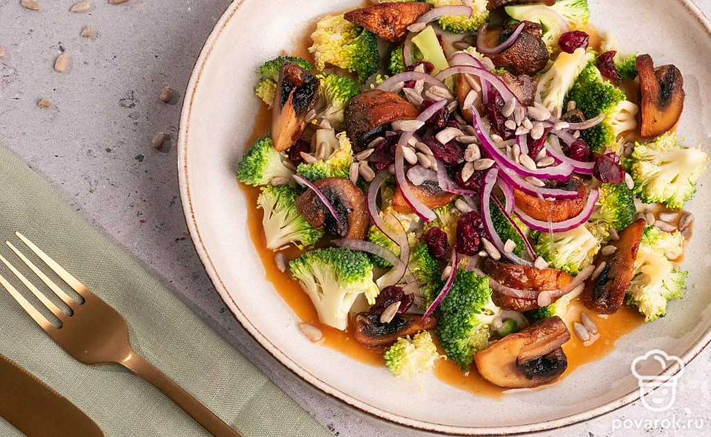 Для тех, кто предпочитает более сытные блюда, предлагаем приготовить свежий салат из сырой брокколи с запеченными грибами. Используйте шиитаки, вешенки, шампиньоны или другие доступные грибы. Этот полезный продукт содержит 65-70 % белка, а также такие вещества, как калий, медь, железо, кальций, натрий. В сочетании со сладким мисо-соусом салат удивит ваших гостей и семью необычным вкусом.