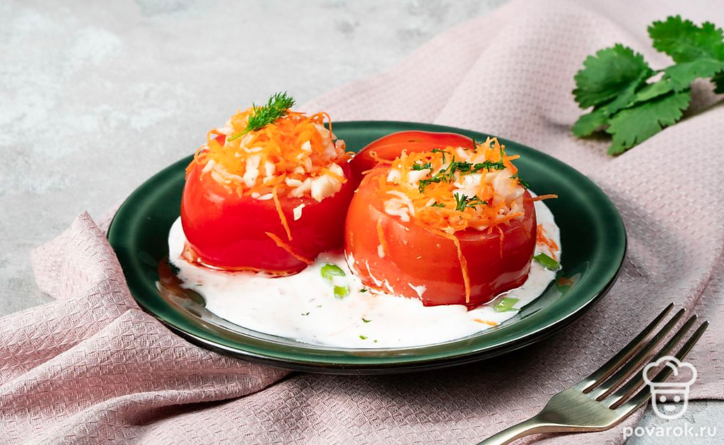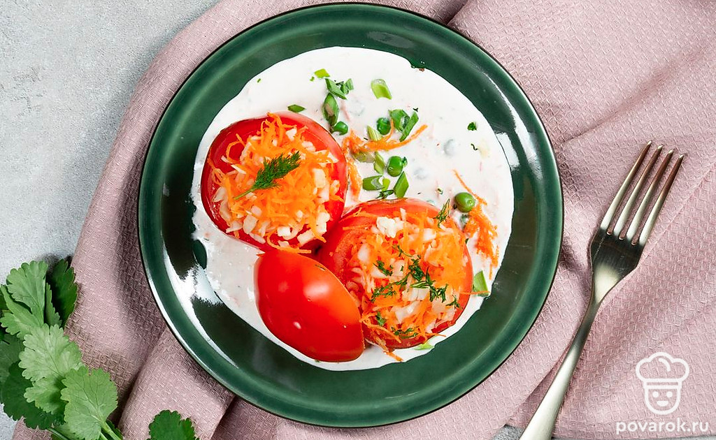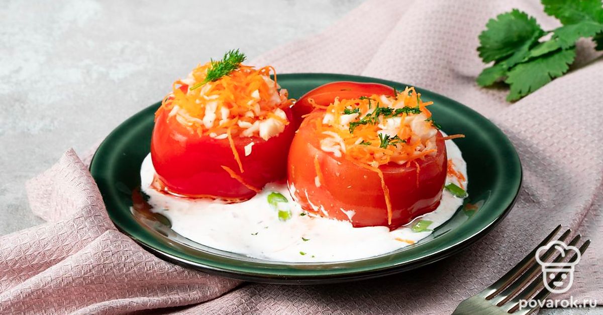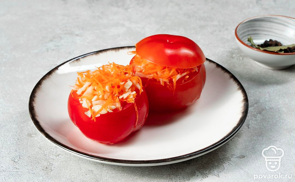 Фаршированные капустой помидоры — прекрасная и необыкновенно вкусная закуска, которую можно готовить и в летнее, и в зимнее время. Она будет прекрасно смотреться как на праздничном столе, так и повседневном. Помидоры отбирайте среднего, но одинакового размера, чтобы они равномерно и одновременно просолились. Для этого рецепта можно использовать помидоры не только красного, но и зеленого цвета. Свежими эти плоды есть нельзя, а вот в соленом виде получается шикарная закуска.