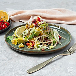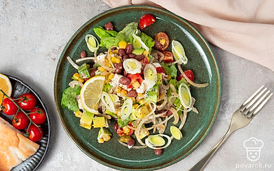 Готовый салат положите в тарелку средней глубины. Украсьте сверху кольцами лука-порея. Рядом с салатом положите ломтики лимона.