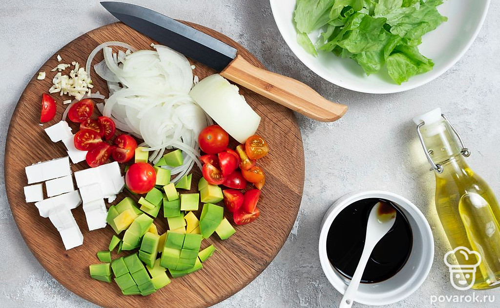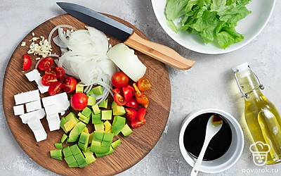 Порежьте ингредиенты. Кусочками порежьте сыр и авокадо. Помидоры черри разрежьте на несколько частей. Лук нарежьте полукольцами, чеснок измельчите, салатные листья порвите вручную. Смешайте масло, сок лимона и уксус, чтобы заправить салат.