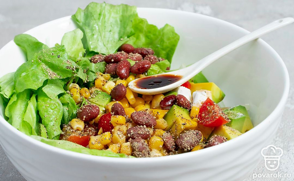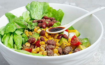Сделайте салат из кукурузы. Соедините нарезанные ингредиенты салата, добавьте фасоль, зерна кукурузы и поперчите. Затем добавьте заправку и тщательно перемешайте.