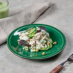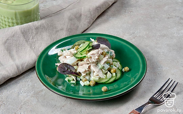 Этот легкий салат из отварной куриной грудки, вареных яиц, огурца и зеленого горошка отлично впишется в диетическое меню. Чтобы сделать ПП-салат еще более полезным, можно заменить поваренную соль на морскую и взять менее жирный йогурт. Йогурт можно также заменить нежирной сметаной, добавив в нее любимые специи. Вместо консервированного горошка можно выбрать консервированную кукурузу, а вместо курицы отварить индейку.
