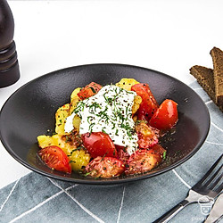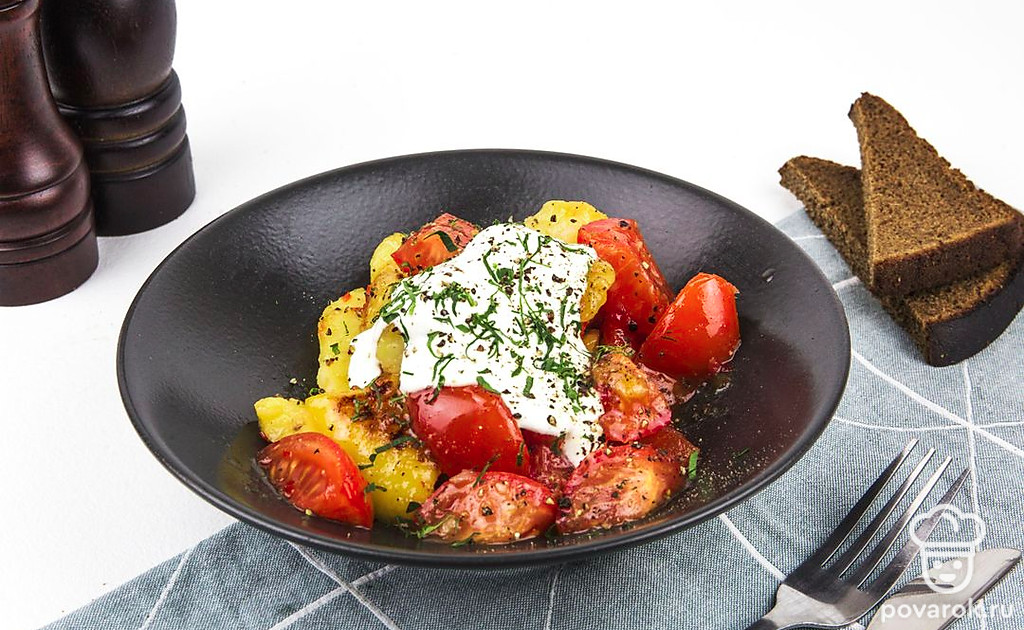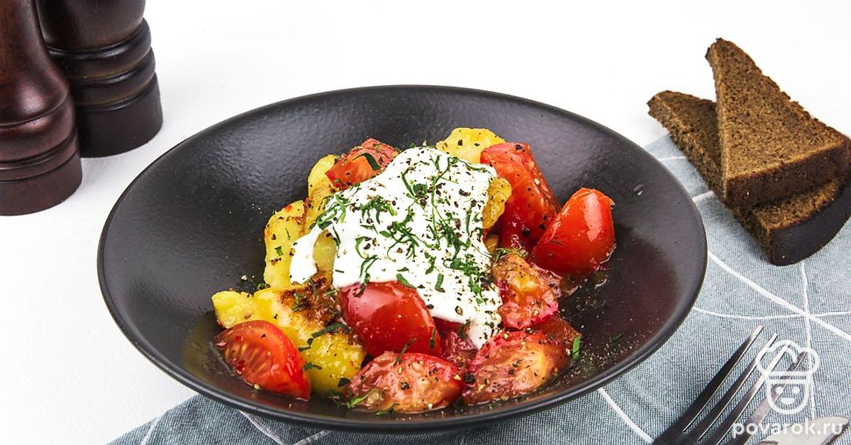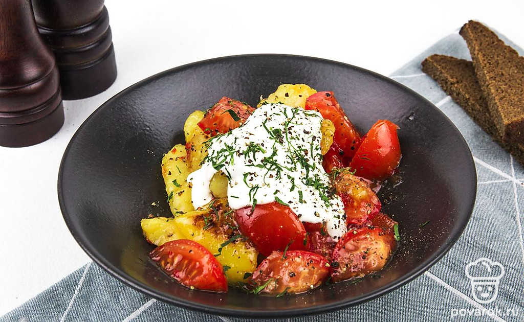 Если вы любите легкие, но в то же время, сытные блюда, то приготовьте салат из томатов и запеченного картофеля. Пряный картофель в сочетание с сочными томатами, заправленный сметаной, порадует даже самого заядлого критика. А если сметану заменить обезжиренным йогуртом или оливковым маслом, то блюдо оценят даже те, кто следит за своей фигурой.