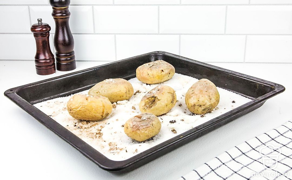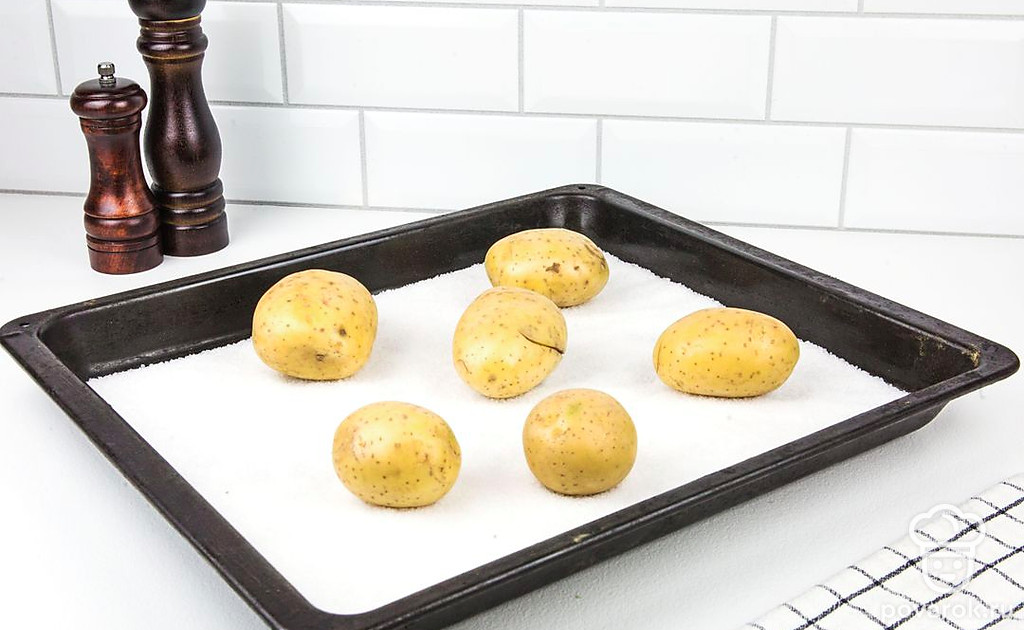 На дно противня насыпьте соль и равномерно распределите ее по всей поверхности, создавая «солевую подушку». Картофель положите на соль. Распределите картофельные клубни подальше друг от друга. Отправьте в духовку на 30-35 минут.