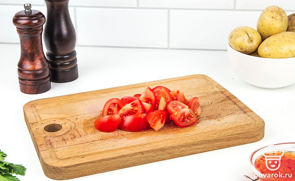Помидоры нарежьте дольками размером 1,5 – 2 см.