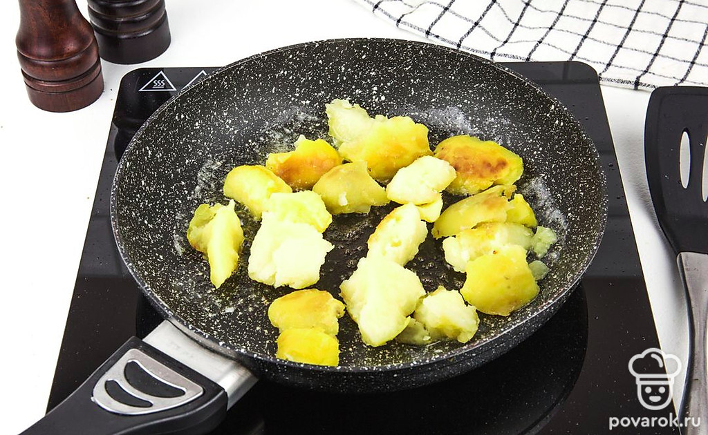В разогретую сковороду положите картофель. Обжарьте его до золотистой корочки в течение 5 минут.