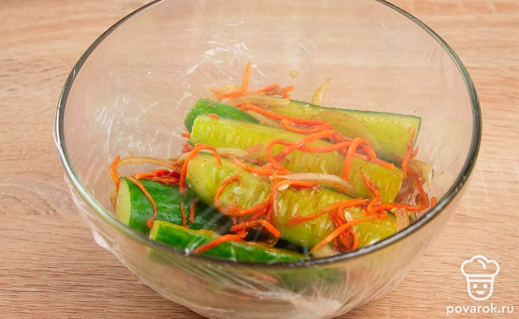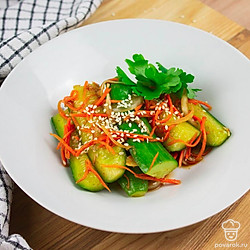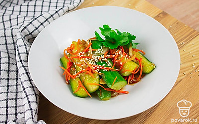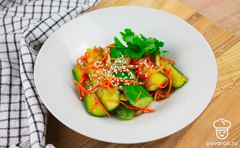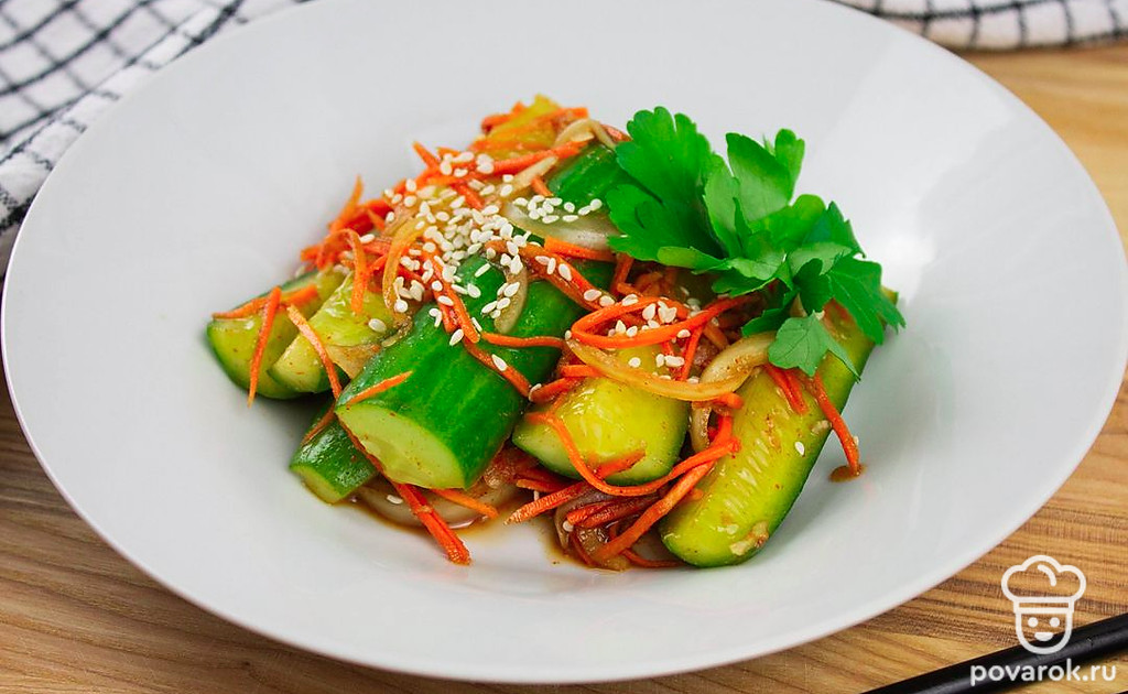 Кимчи с огурцами представляет собой пряную корейскою закуску. Кимчи готовят методом лактоферментации, т. е., используют бактерии, которые переваривают сахар в молочную кислоту, которая придает блюду характерный кислый вкус. Бактерии, входящие в состав кимчи относятся к классу пробиотиков, поэтому полезный для здоровья. Кимчи способствует укреплению иммунной системы, полезен для пищеварения, обладает противовоспалительными свойствами.