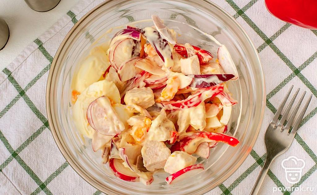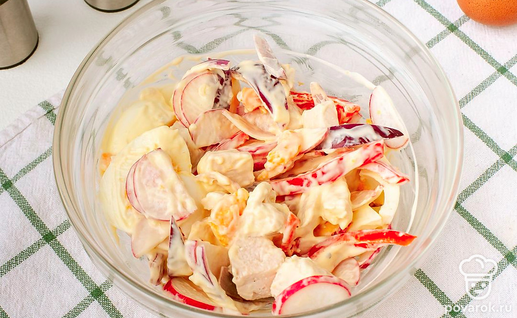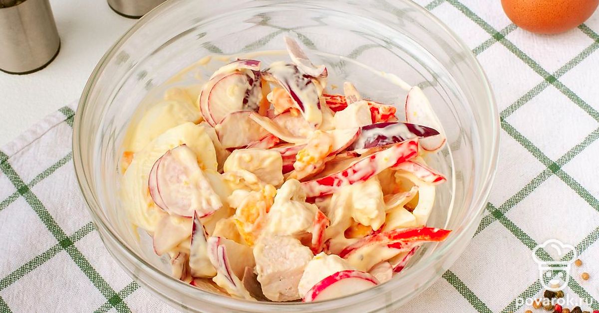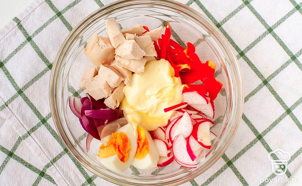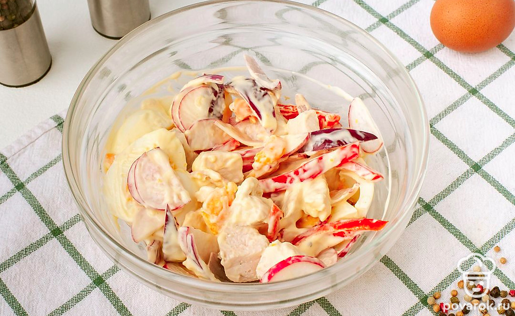 Салат с курицей и редисом — вкусный и простой салат отлично подходит как источник пополнения сил в течение дня или для легкого, но сытного ужина. В данном рецепте мы используем майонез, вы можете заменить его сметану или греческий йогурт. Это сделает салат воздушным.