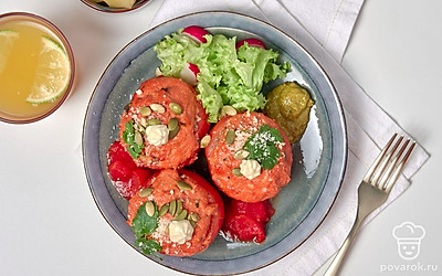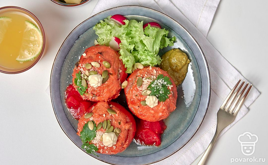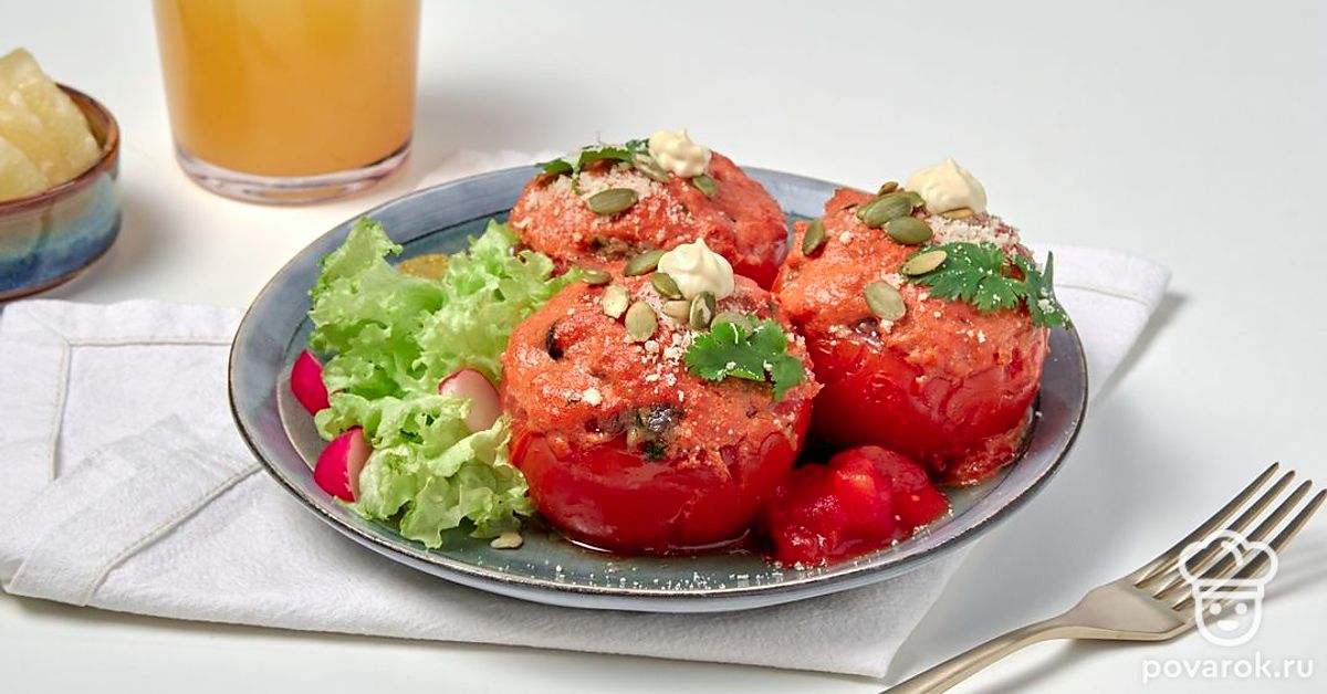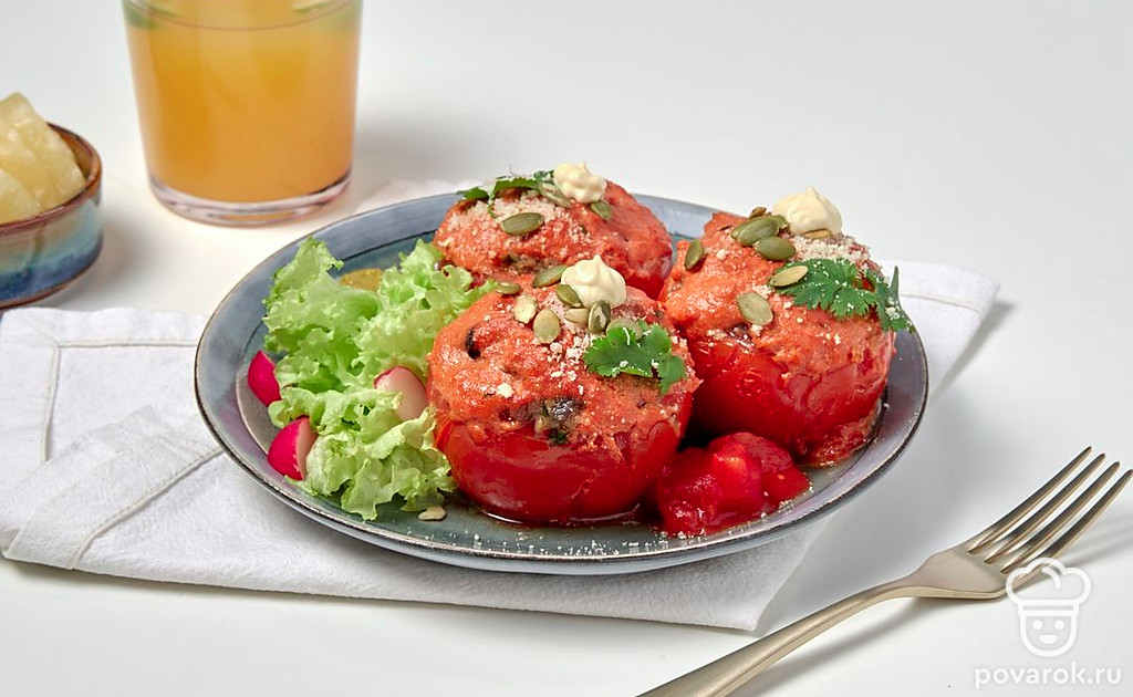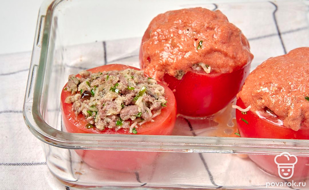 Фаршированные помидоры — популярное блюдо европейской и русской кухонь. Помидоры отлично сочетаются практически с любой начинкой и хорошо будут смотреться на любом столе. Начинка из мясного фарша и баклажанов сделает блюдо сытным и насыщенным вкусом. Для приготовления возьмите фарш из одного или двух видов мяса. Помидоры должны быть мясистыми, упругими и обязательно все одного размера. Выбирайте сыр твердых или полутвердых сортов — российский, голландский, эдам, которые имеют выраженный вкус.
