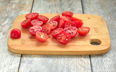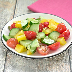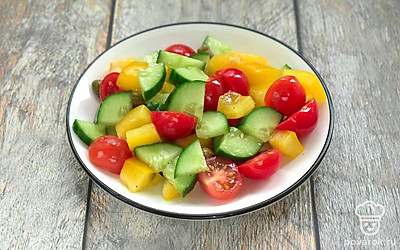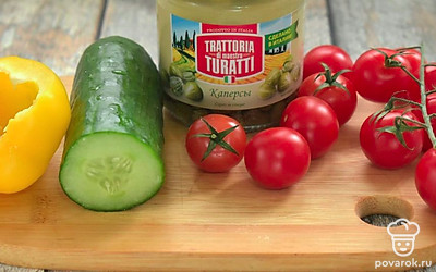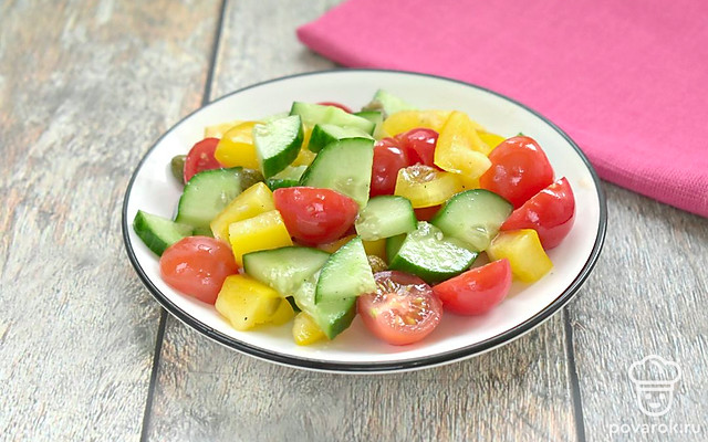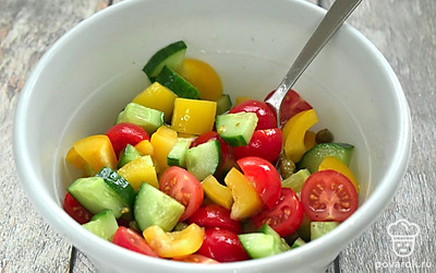 В большой салатнице аккуратно соедините нарезанные помидоры черри, сладкий перец, огурец и каперсы. Полейте салат оливковым маслом по вкусу. Тщательно перемешайте, чтобы все овощи пропитались ароматом масла.