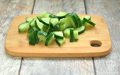 Огурец нашинкуйте полукольцами или четвертькольцами.