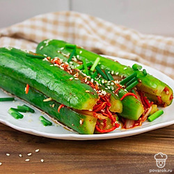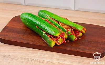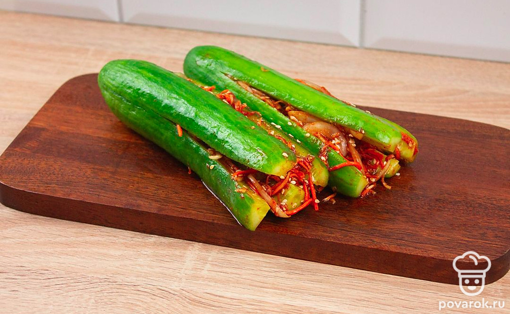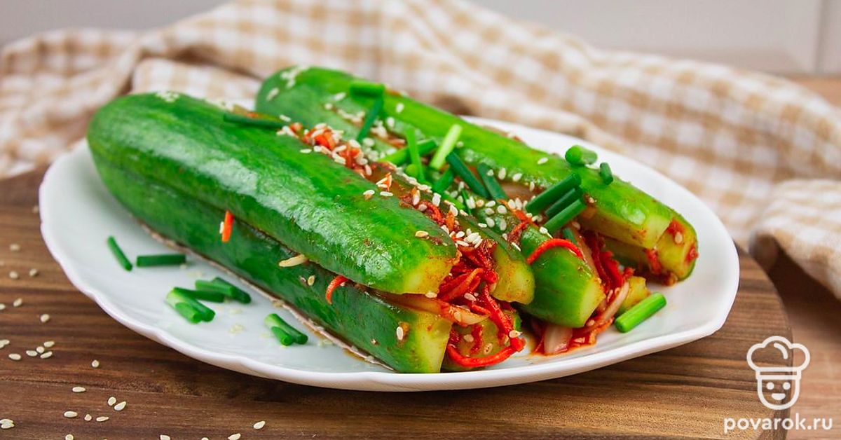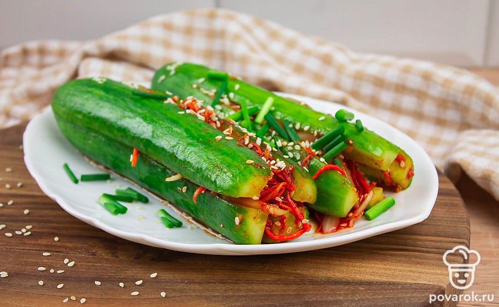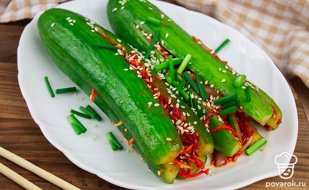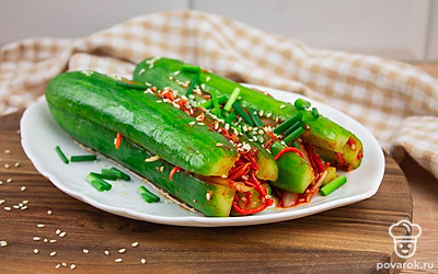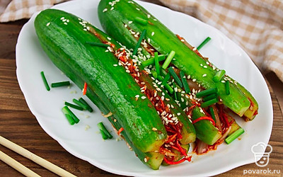 Это диетическое блюдо азиатской кухни придется по вкусу всем любителям вегетарианства. Фанаты острых и пикантных рецептов тоже останутся довольны, приготовив кимчи из огурцов. Кимчи представляет собой овощное блюдо со специями и приправами. Вариантов приготовления очень много. В этом рецепте начинку смешивают отдельно и наполняют ею разрезанные вдоль огурцы. Морковь, чеснок, паприка и кориандр в начинке дают блюду запоминающуюся остроту! Кимчи станет хорошим дополнением к основному блюду!