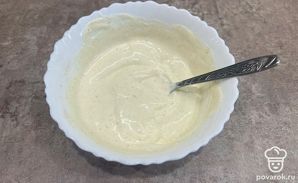 В тарелке смешайте сметану, майонез, йогурт, горчицу и уксус. Добавьте соль, сахар, перец по вкусу. Хорошо перемешайте.
