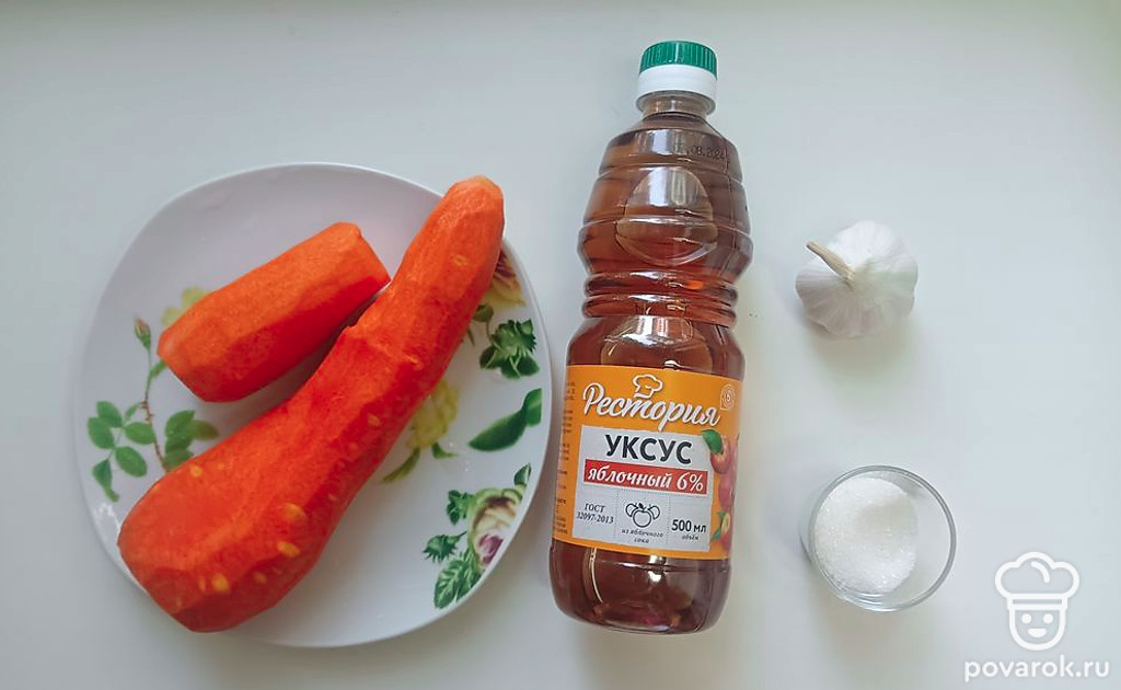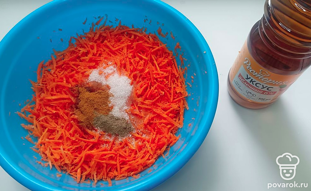 Добавьте к моркови соль, сахар, черный и красный острый перец. Влейте яблочный уксус и все перемешайте.
