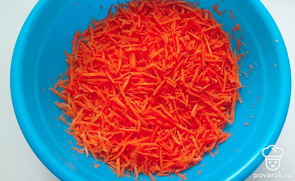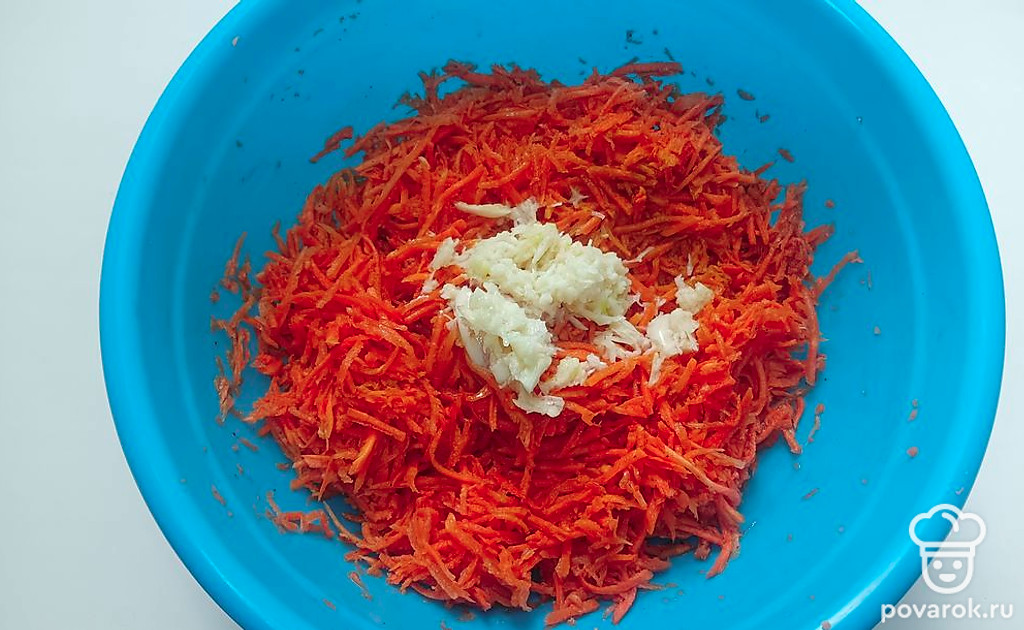 Измельчите чеснок и выложите поверх моркови, не перемешивая. В сковороду налейте масло и нагрейте его на сильном огне. Горячее масло влейте на чеснок и затем все перемешайте. Дайте моркови настояться в холодильнике несколько часов.