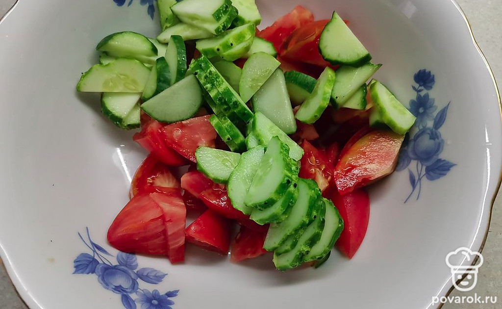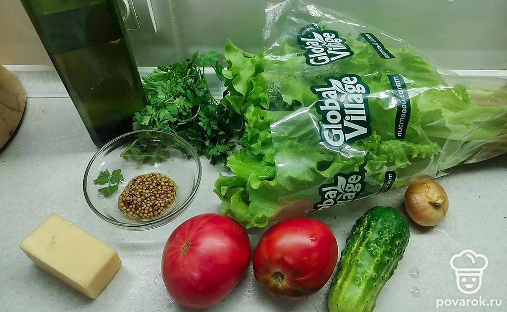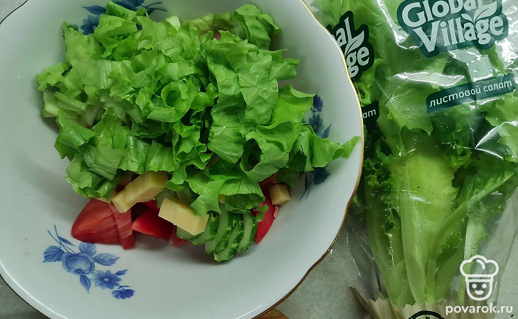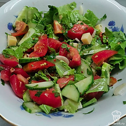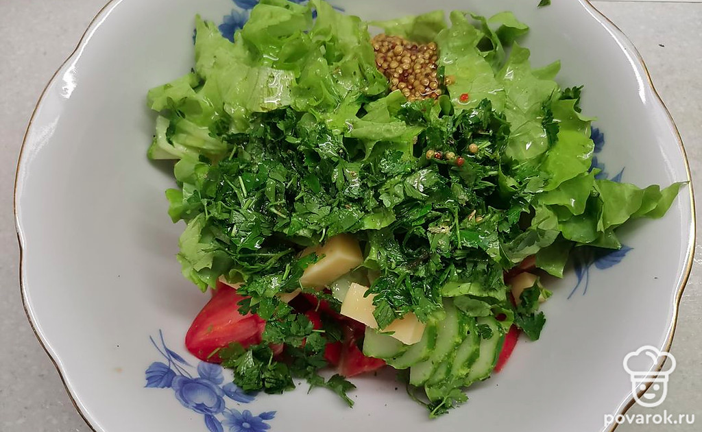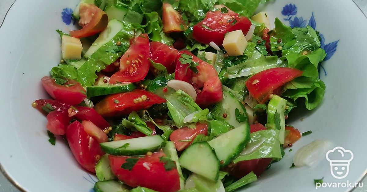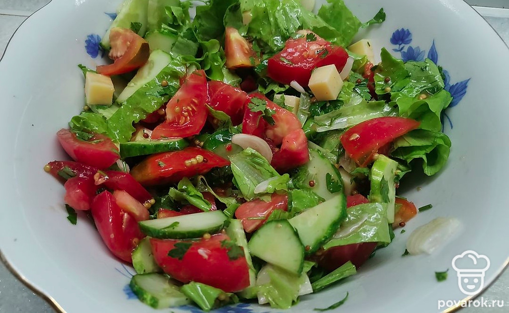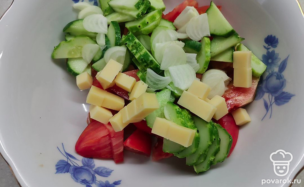 Очень сочный, хрустящий овощной салатик. Кусочки сыра придают ему дополнительные сливочные нотки вкуса. Попробуйте, вам обязательно понравится!