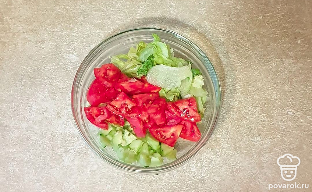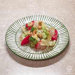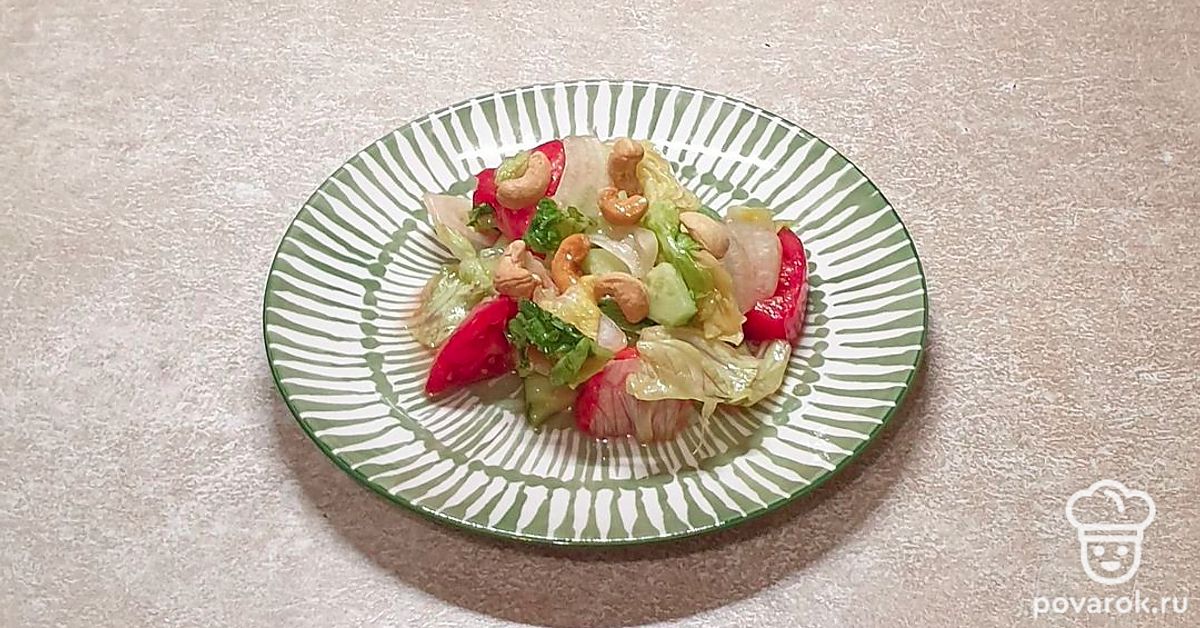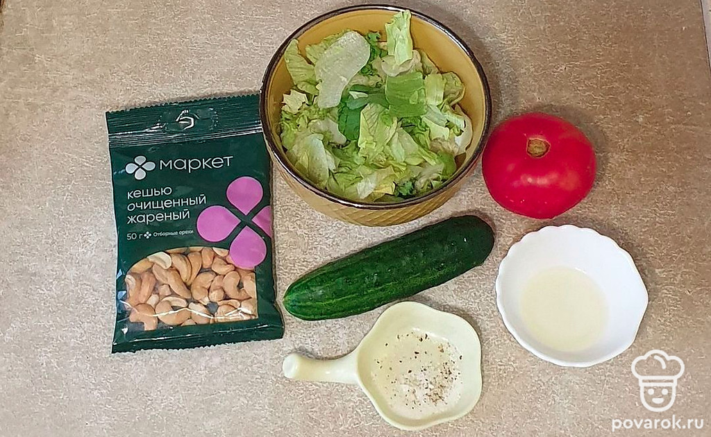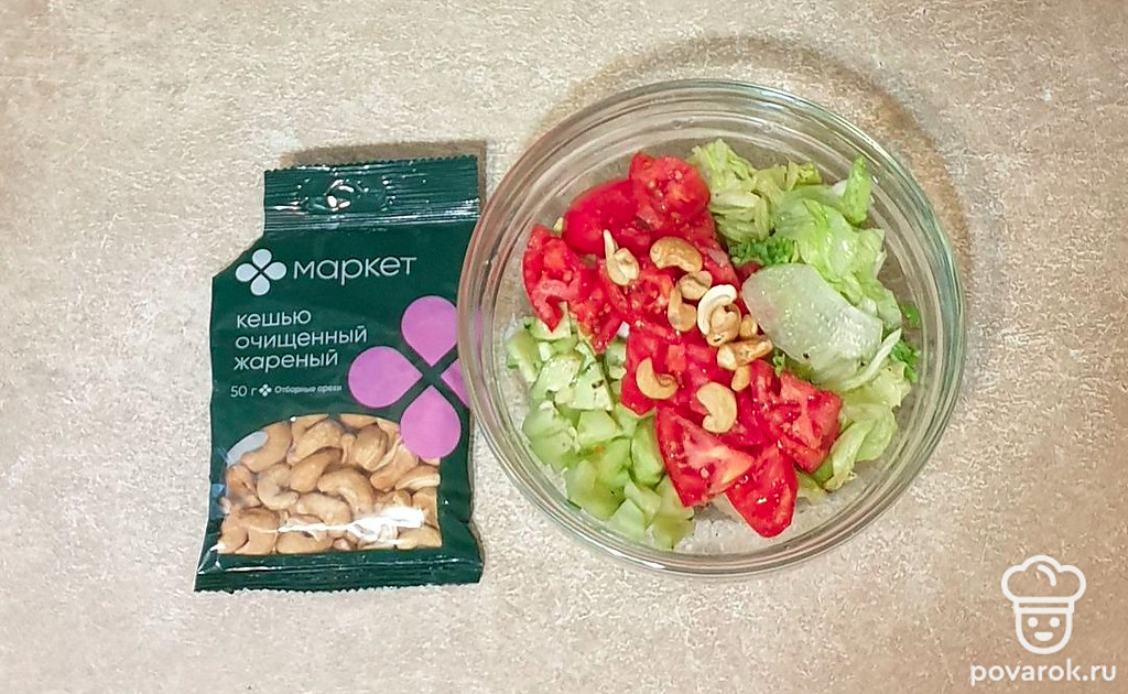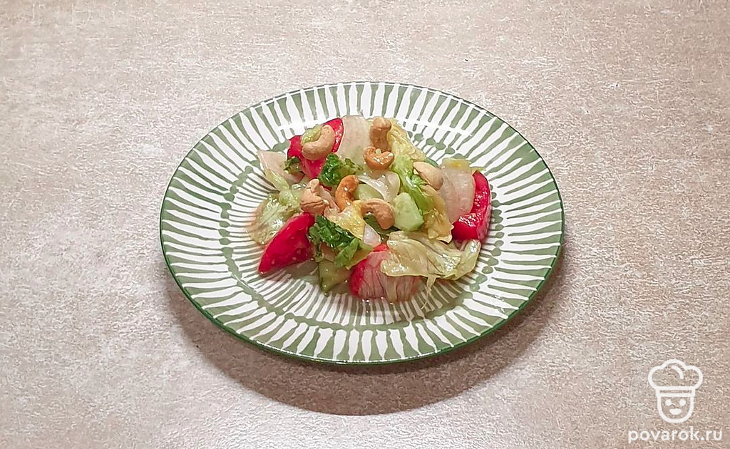 Овощной салат с кешью, оливковым маслом и салатными листьями. Благодаря орехам кешью салат приобретает очень интересный вкус.