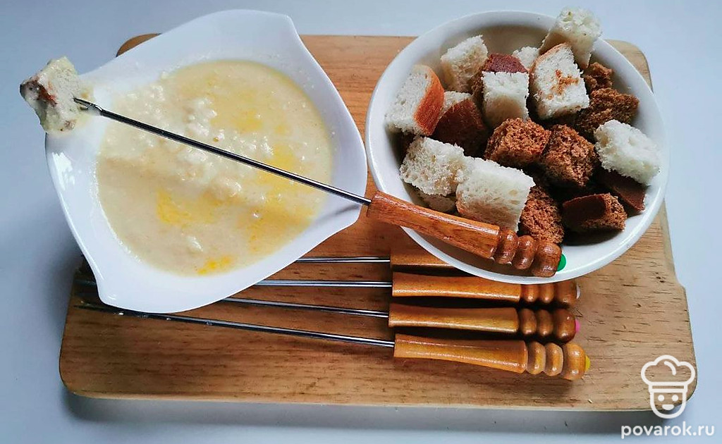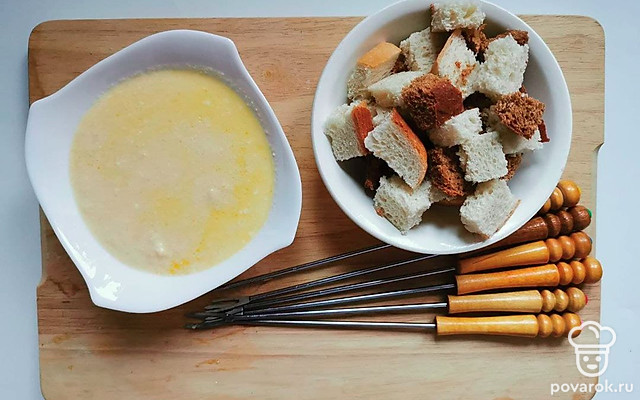 Поставьте емкость на горелку и подавайте фондю с хлебом и сыром.