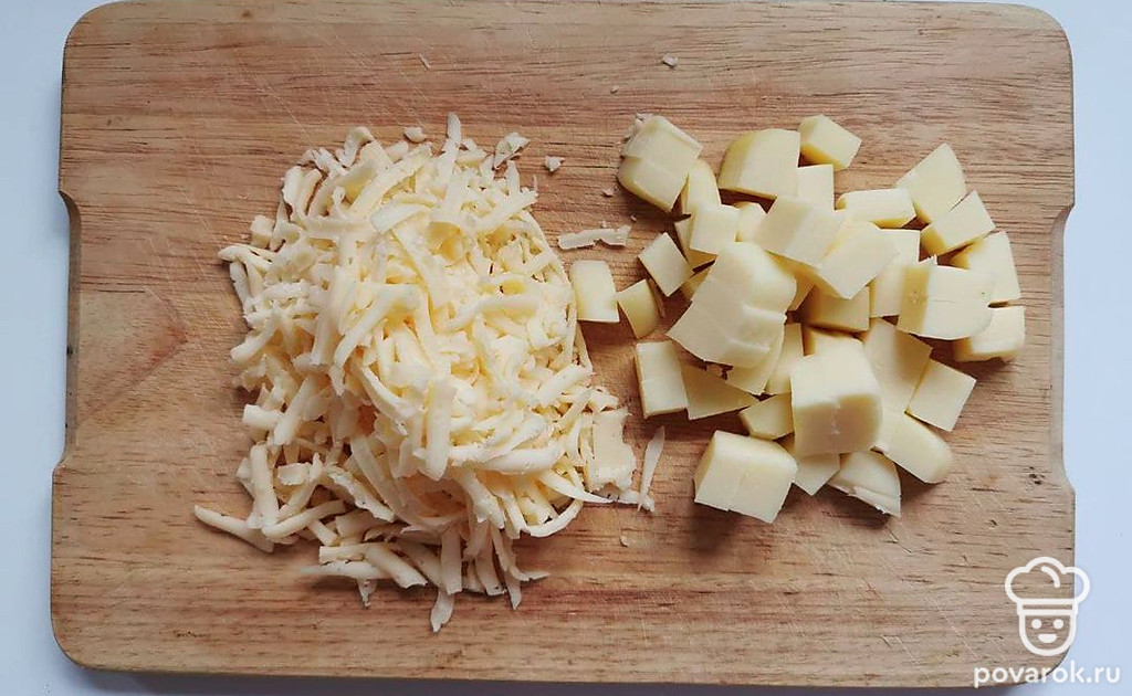 Возьмите сыр. Сулугуни нарежьте на кубики примерно 1 см. Твердый сыр натрите на среднюю или крупную терку.