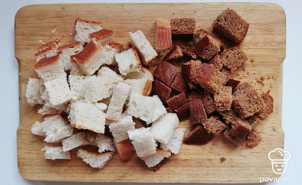 Хлеб нарежьте на кубики 1,5-2 сантиметра. При желании подсушите их слегка на сковороде без масла.