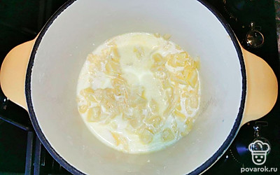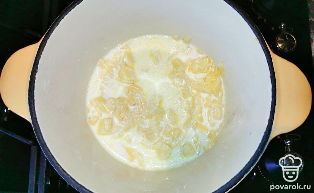 Отделите желток от белка. Снимите с огня емкость со сливками и сырами и влейте яйцо, смешанное с остальными сливками. Все перемешайте.