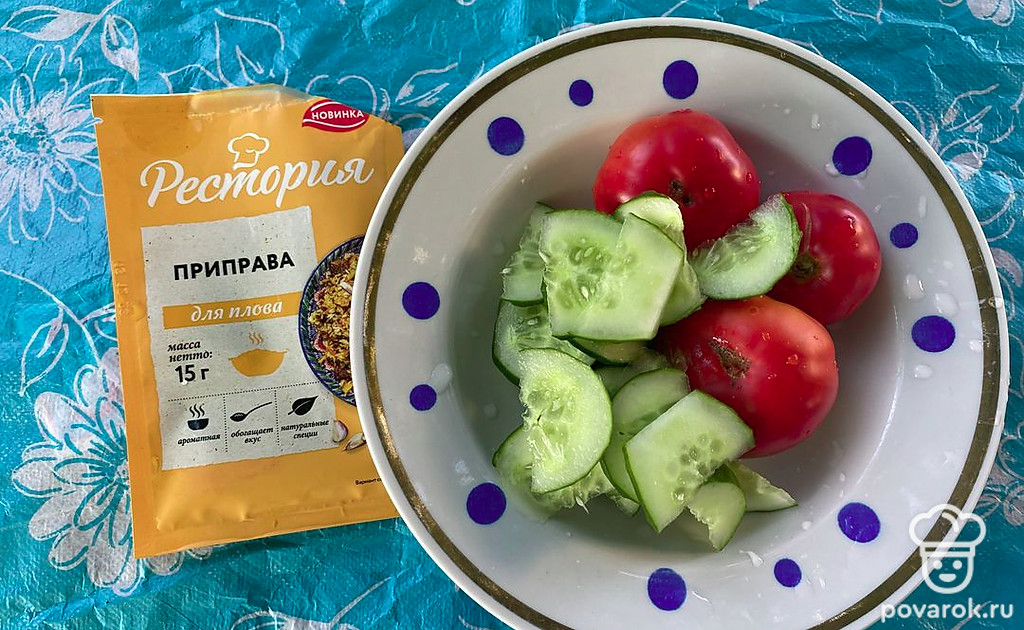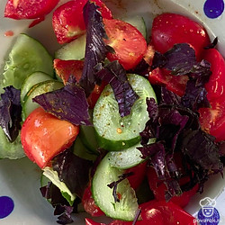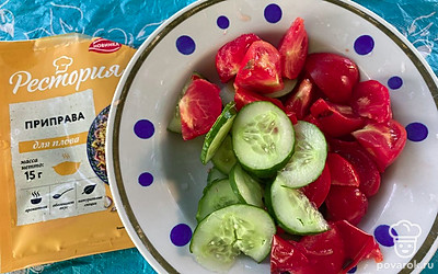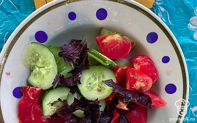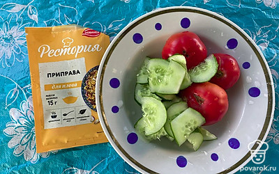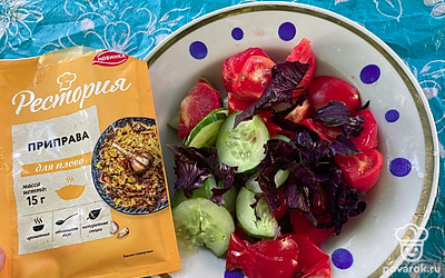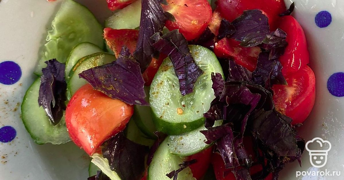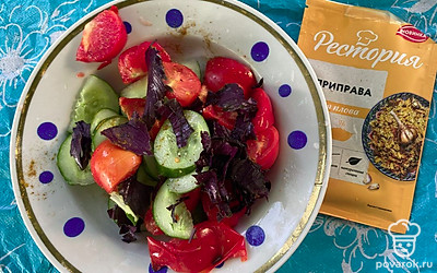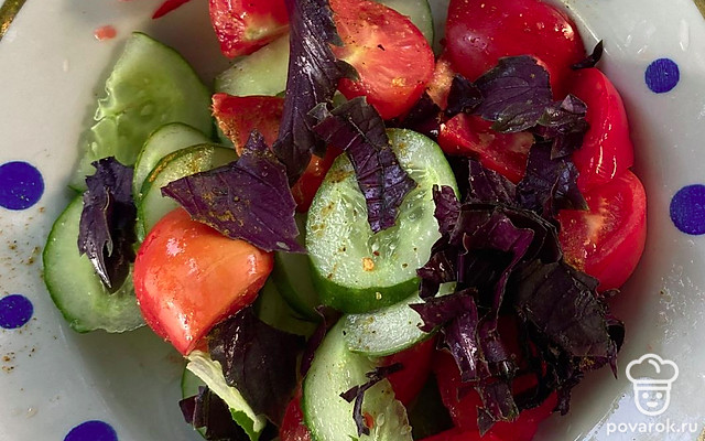 Салат с помидорами и огурцами с приправой понравится вам своим тонким вкусом.
