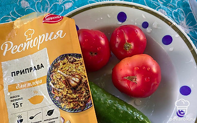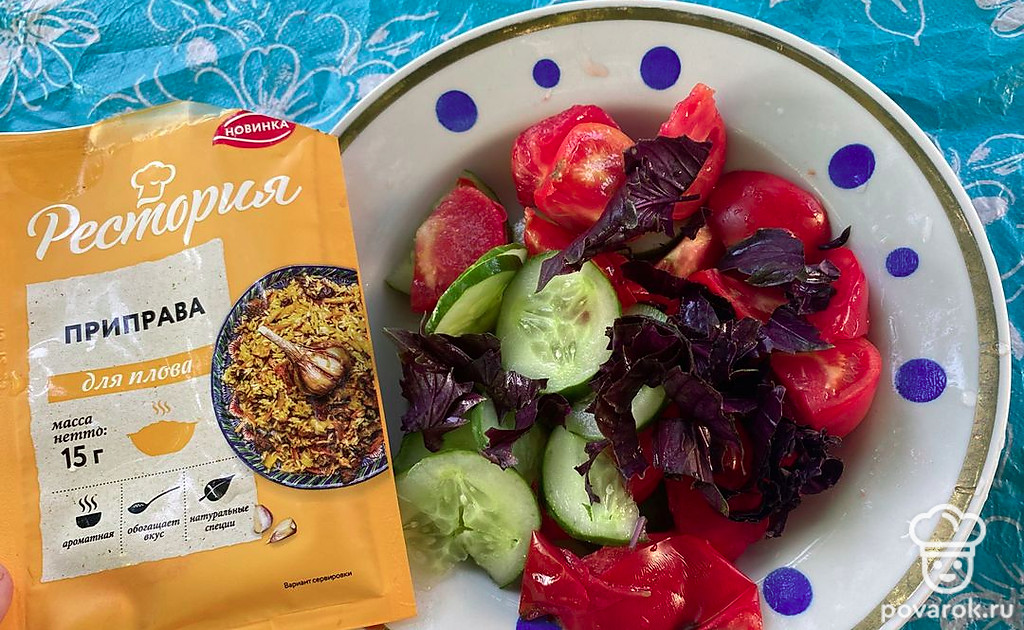Сверху посыпьте приправой для плова. Салат получится очень вкусный и ароматный.