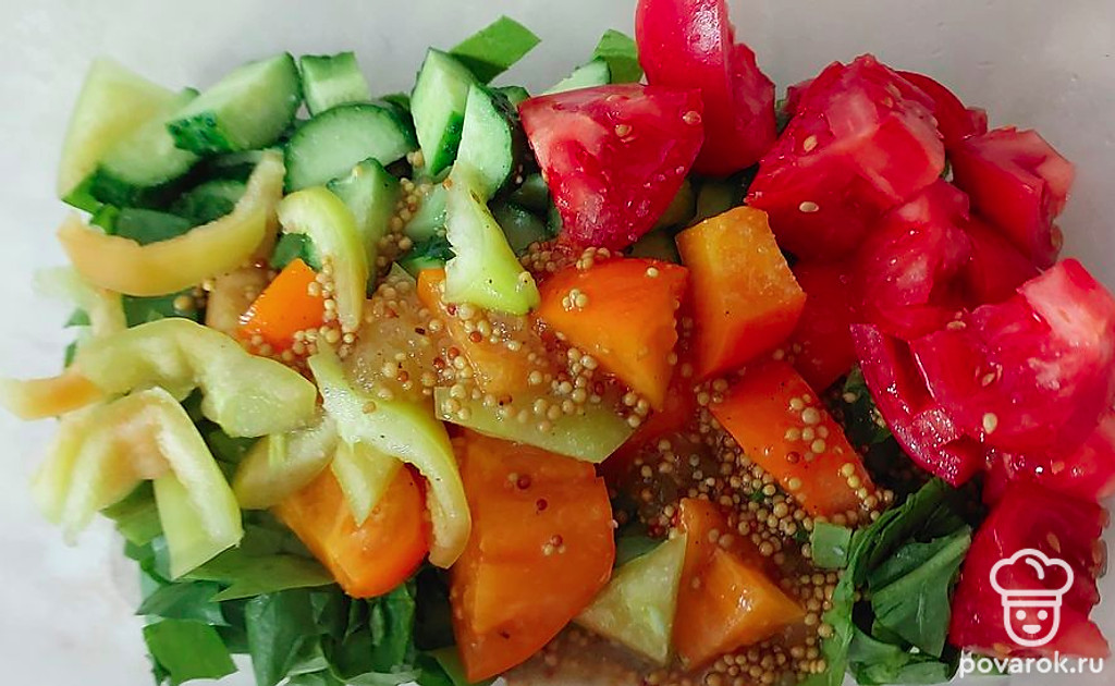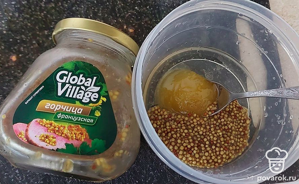 Приготовьте заправку. Соедините масло, мед, горчицу и соль.
