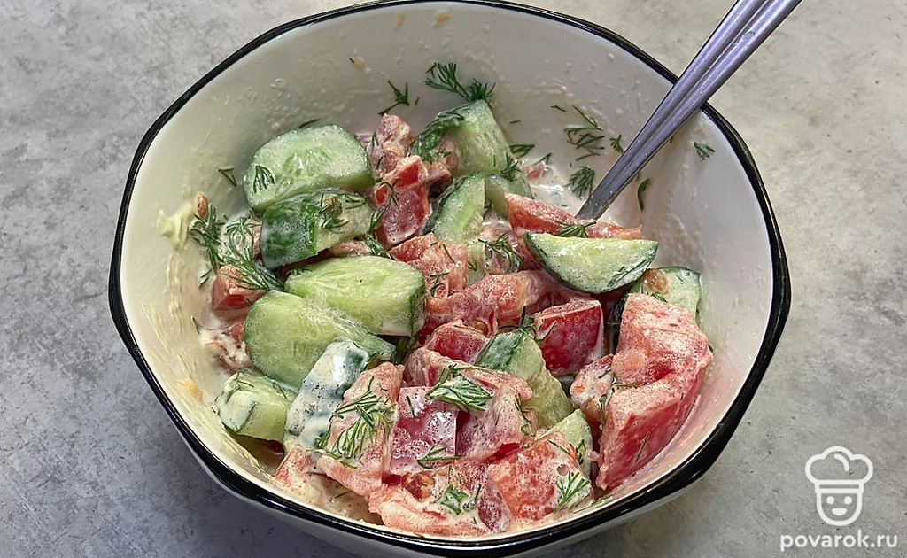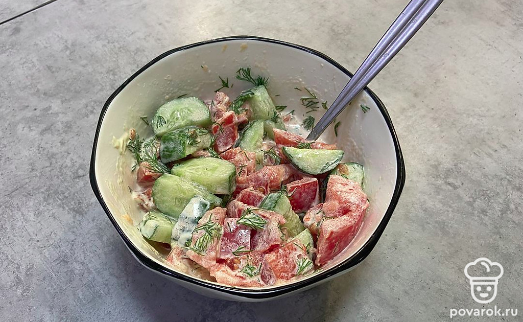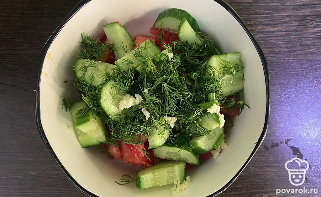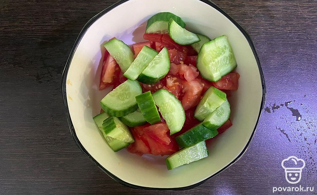 Огурец и помидор нарежьте небольшими кусочками и отправьте в салатницу.