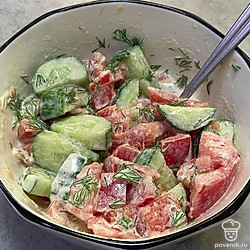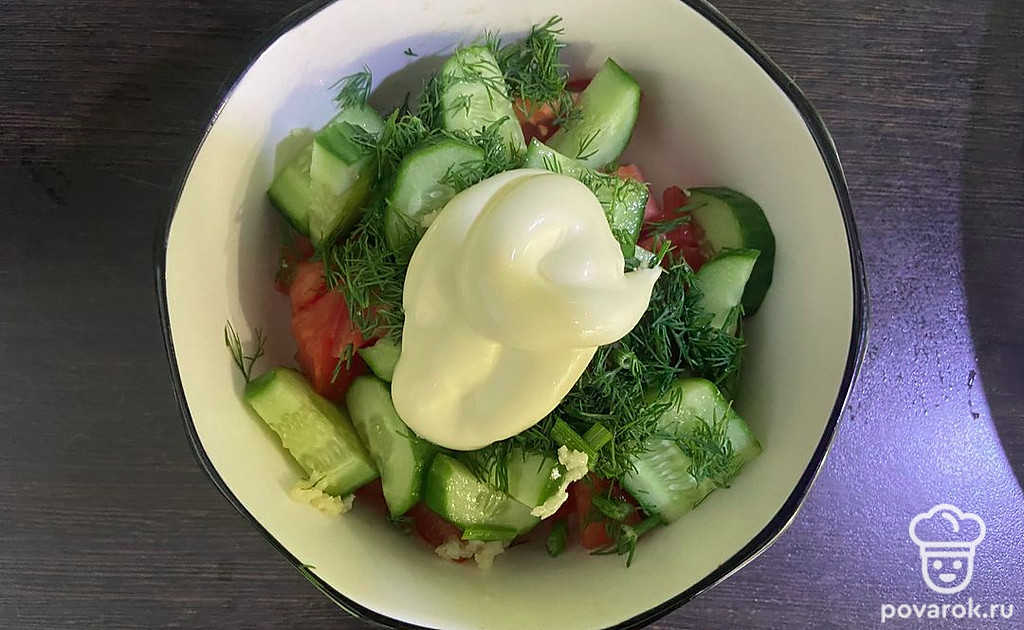 Овощной салат с чесноком и зеленью в майонезом соусе